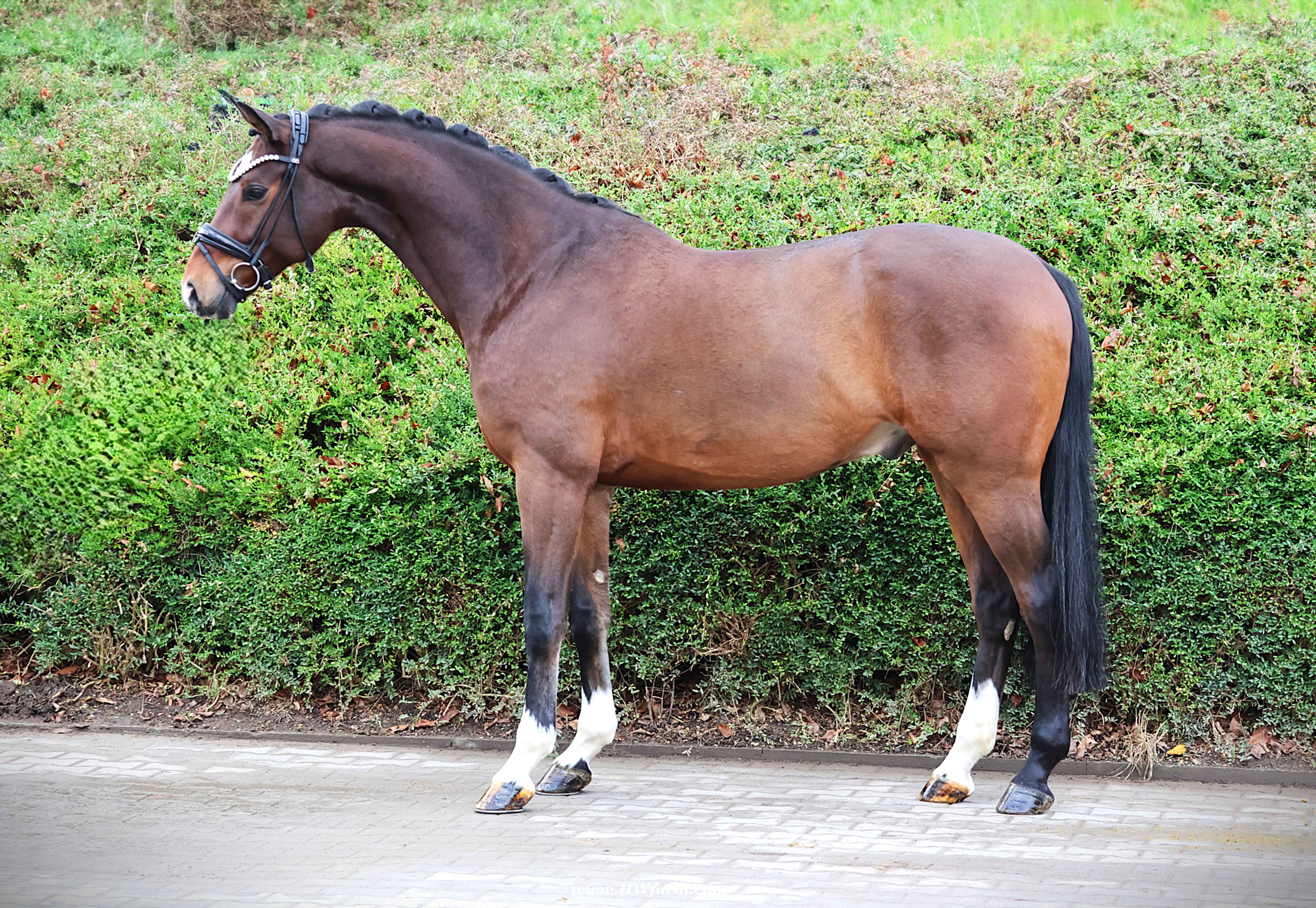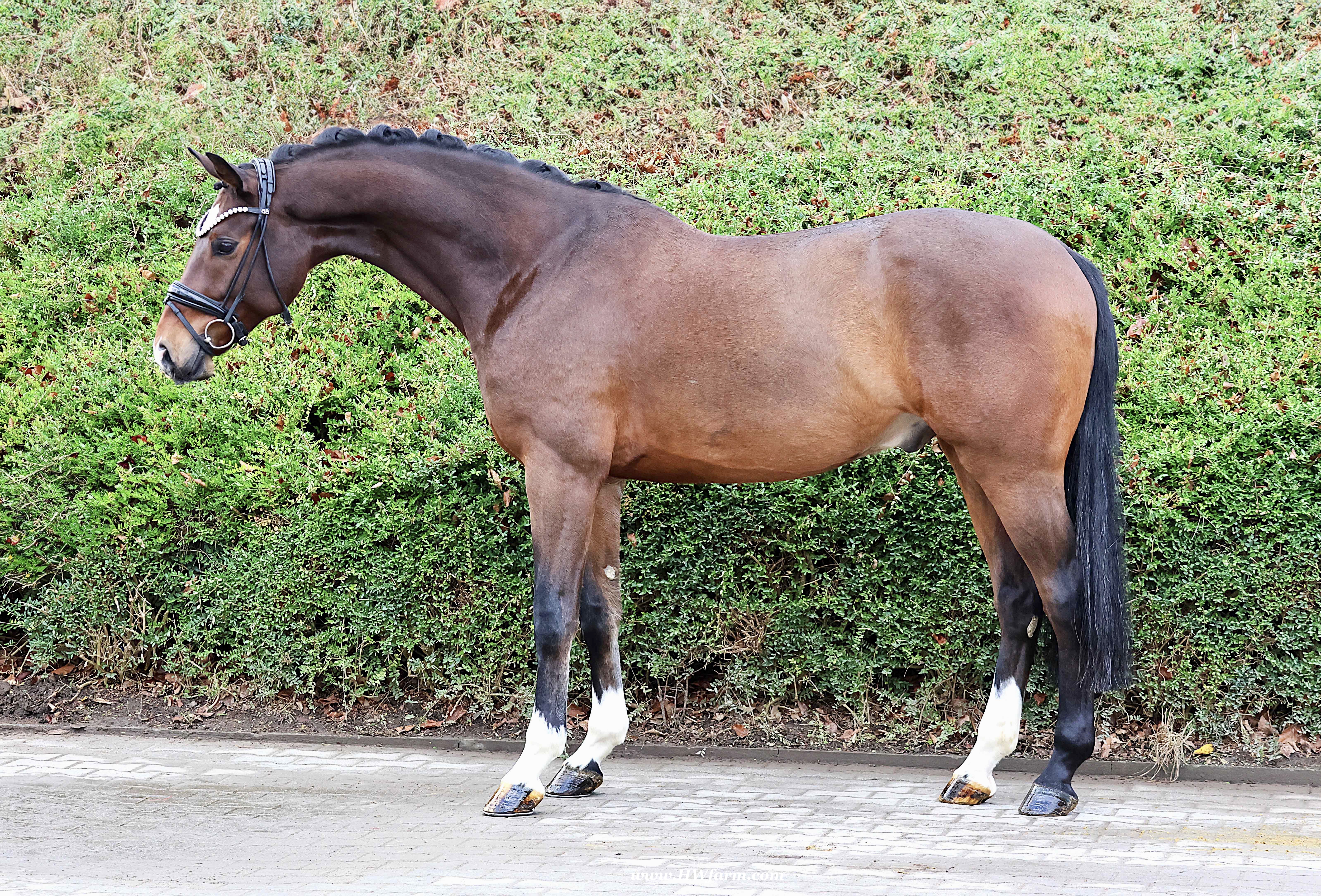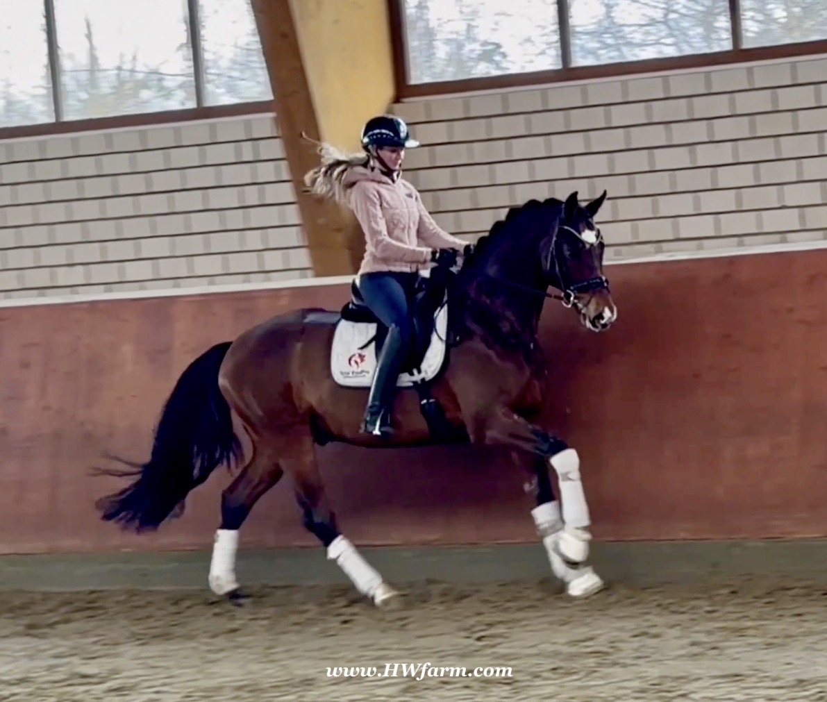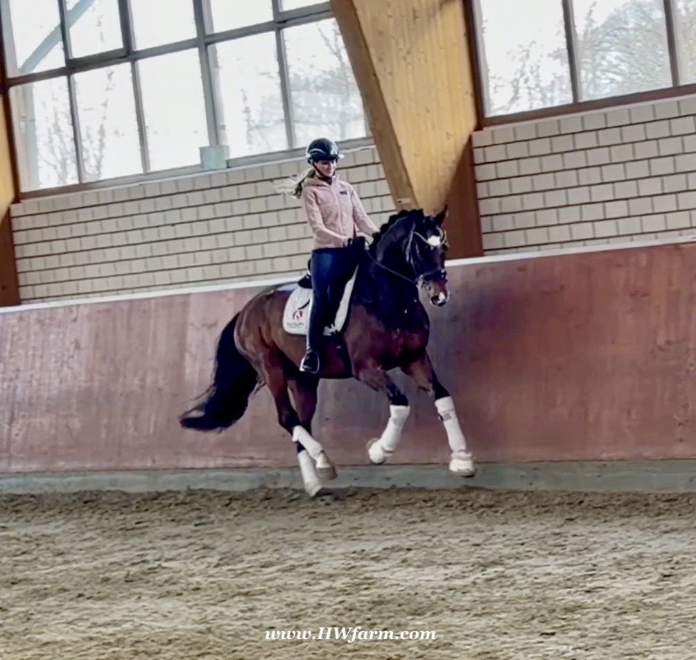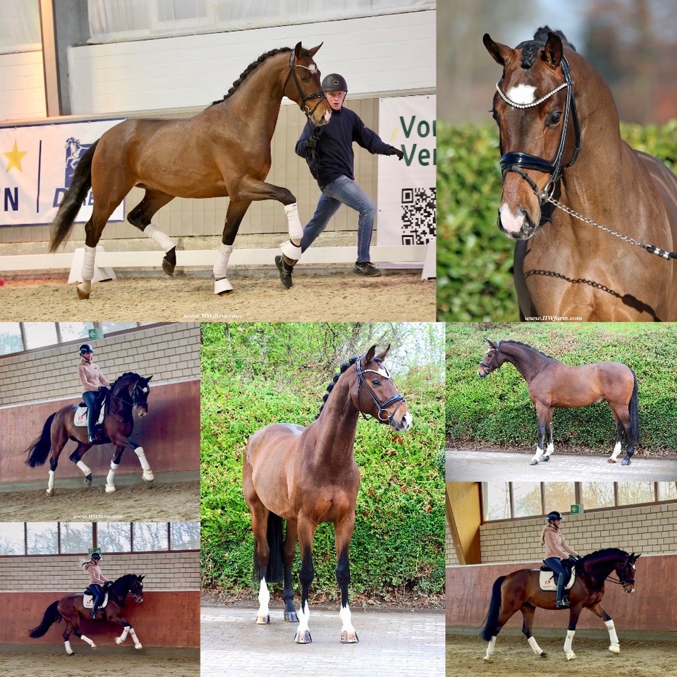Armani Gold HW, brown Westphalian gelding by Arcachon NRW/Sezuan born in 2020, standing approximately 170 cm or 16.2 hands. Armani Gold HW, is a clone to his sire, in everything we could hope for. The famous Arcachon NRW - series winner in young horse competitions. Arcachon NRW was premium stallion und reserve champion at the licensing in Münster in 2017. With the best dressage result of 8,11 he finished the 14-day-test in Neustadt. In Summer 2018 he managed to impress by winning three consecutive young horse competitions, a series he was able to repeat as a four year old, where one of these competitions was nothing less than the NRW-youth meeting, which he won with a whopping 8,6. But nevertheless the biggest success of his young career took place at the "Bundeschampionat" 2019, the German championships for young horses. After the win in the preliminary test of the four year old stallions, he managed to win the bronze medal in a thrilling final. The quality of his foals became clear after his offspring had presented itself in an great way at several different foal shows. On the basis of his promising offspring and his sports career, the Westphalian association honored him with the name suffix "NRW". It serves as a seal of quality, usually given to top-performing dressage horses, show jumpers, or licensed stallions that have achieved distinction. The beautiful Arcachon NRW combines very modern and sportive bloodlines with the three international Grand Prix winners Apache, Blue Hors Hotline and TCN Partout in the direct pedigree. His father Apache, who died far too early, is one of the most successful sires of the KWPN breeding and had an exemplary career from sporting and breeding perspective. With his rider Emmelie Scholtens he became part of the Dutch Olympian squad in 2015 and was nominated for the European championships in Gothenburg. With his offspring he dominated the licensing in s' Hertogenbosh and turned to became one of the most requested stallions in Europe. Grandfather Hotline won his first GP Special in 2013. In 2016 he was part of the winning Danish squad at the nations cup in Odense and helped the damish squad to succeed at the CHIO Aachen with impressive results over 70%. His most successful offspring is the Grand Prix winner Hermes ridden by the german Uwe Schwanz. The third father in his pedigree, Sunny Boy, is a direct offspring of the "Finnländerin"-damline and was a small-tour-winner. With special pleasure Johann Hinnemann thinks back at TCN Partout, the fourth Father of Arcachon NRW, who was very successful on international Grand Prix Level and contributed to the dutch-german showdown in the international dressage world. Arcachons dutch dameline (Schridde 381) produced numerous successful sport horses. Several Grand Prix horses and licensed stallions are directly related to Arcachon's NRW third mother Ofurstinels.