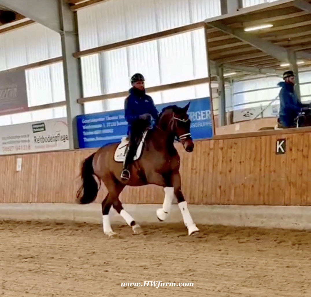 Secret Spice HW bay Oldenburg gelding, by the powerful, dynamic BundesChampion, Vice World Champion Secret/Come On born in 2018, standing approximately 176 cm or 17.1 hands. Secret Spice HW, is one of a kind, a very rare find, his sire is the 2020 Bundeschampion Secret and outstanding National German 6yo Champion, as well as World Champion for young dressage horses Ermelo 2019 - Secret - an exceptional horse and even Vice World Champion! Secret and his rider Jessica Lynn Thomas delivered a spectacular first round in the qualification of the five-year-old dressage horses. They received an 8.8 for the permeability, the step 9.5, the gallop 9.7, the perspective 9.8 and even 9.9 for the trot. All in all, this gave a total result of 9.54 points and the victory was not to be taken from the two. In the final, Secret had to give up just under 0.02 points, despite a further increase. The pair won the silver medal of the five-year-old dressage horses with 9.64 points. The judge's comment: "A fantastic horse! Always in the flow, always easy. It is a pleasure to judge such a horse. " In terms of breeding, the descendants of the Secret also seamlessly linked to his father's success in 2019. Country after country was heard from his descendants. In the far north, in Schleswig-Holstein, Secret set one of the price peaks at the Glanz and Gloria auction in Delingsdorf with € 21,000. In Verden, Status Quo was one of the most sought-after youngsters at € 25,000. With the appropriate name Somebody to Dance, Secret was also among the price peaks in Münster on the occasion of the Westphalia Week. In Vechta, Serge Gainsbourg triumphed as the most expensive foal in 2019 with a hammer price of 150,000 euros. The price structure was followed by Secret Emperor, another son of the Secret. This went to Austria for € 42,000. And also in the south of Germany in Nörtlingen, it was once again a subsidiary of our Secret, which was one of the top prices of the auction with a hammer price of € 25,000. The fact that his offspring are also in demand abroad was demonstrated by a filly from Secret, which took the reserve winner classification of dressage-stressed filly at the Swiss Sport Foal Championships and then found a new owner with a surcharge of 28,000 francs (about 25,000 €). In the Netherlands it was the colt with the appropriate name - One to Remember- that became the top foal in the auction at € 22,000 "The highlight of the day comes from Schwaiger and bears the appropriate name Sensation, from Secret - Fürst Grandios. A colt with a value of 9.67 (type / stature: 10, exterior / correctness: 9, movement: 10) really leaves nothing to be desired and makes words superfluous. "This is how the Austrian Horse Breeding Association described its winning foal 2019. Secret easily met the expectations placed on him. He completed his 14-day test in Schlieckau with a dressage final score of 9.5. He was able to shine again at the Bundeschampionat in Warendorf, where he was only named Vice Bundeschampion due to the rider marks. No more words need be said about father Sezuan, the celebrated triple world champion of young dressage horses. The mother line of the Secret, line 853 of the Sudette, produced numerous internationally represented performance horses. Already 38 other licensed stallions originate from this dam line. As the dam's sire, we find St. Moritz, which has only been well remembered at our station, and which, due to the fact that it was too short to work at Gestüt WM, produced a whole range of interesting, sporty and successful offspring. The maternal pedigree is rounded off by the proven successful combination of the Celler state stud stallions Rotspon, Argentan, Woermann and Lugano. Another flagship of this mother line is the Bundeschampion of five-year-old dressage horses and world champion of six-year-old dressage horses Lordwoods Dancing Diamond. Due to the genetic blood combination of the top class in this flagship pedigree, coupled with the high level of commitment of this rough diamond, we offer today's savvy dressage horse breeder a very special offer. Secret Spice HW's dam sire is Come On, first competed by Harm Thormählen, he continued his career in 1991 with Carsten-Otto Nagel. With Ludger Beerbaum and Ralf Schneider, numerous international successes were added, such as the victory at the German Masters, a second place in the Grand Prix of Göteborg/SWE, a third place in the Hickstead Derby/GBR and a fourth place in the Hamburg Jumping Derby. Ridden by Her Royal Highness Princess Haya of Jordan, Come On was very successful from 1997, notably at the CHIO Aachen. Come On produced eight licensed stallions from his time at stud, including Clever Boy, Come Well and Checker, and Cosmic FRH, Champion of the Nuremberg Burg Cup. Come On, a tough international competitor with Ludger Beerbaum and Ralf Schneider, yet gentleman enough to be a pleasant partner on the international stage for Princess Haya. Secret Spice HW, a gentleman with a golden heart, check out that freedom in the shoulder and active hind leg! He has a superb rhythm and swings softly through his back, he is very easy to sit. His gaits are just breathtaking, he barely touches the ground. The canter comes with a phenomenal uphill movement with lots of air time, jumping well up, out and under every single time. He is so much fun to watch. The trot is supple and as elastic as it gets, his front legs reach far out and up, totally amazing. His active hind end enables him to look effortless and his hind legs are reaching far under his body. He will be a piaffe and passage machine, that's very obvious already. A modern dressage horse as it should be. Already successfully shown, Secret Spice HW loves collected work, he goes easily through the neck, on the bit, featherlight for the riders hand. He is just stunning and a horse of a lifetime. His lateral work is a blast, half steps seem easy, flying changes on top, wow - what a horse! A definite GP