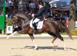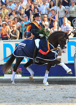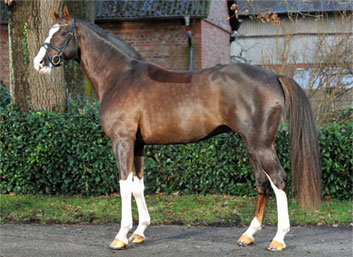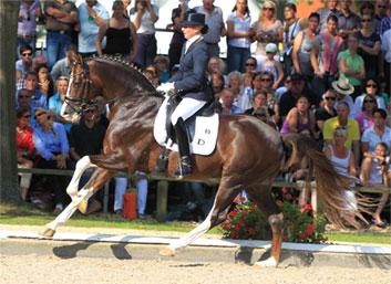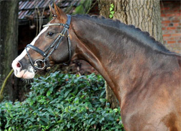 Benicio, Liver Chestnut Hanoverian Stallion, by (Belissimo M / Velten Third) born in 2005, standing approximately 16.2 hands. In October 2007, the stud, Callaho, traveled to the Hanoverian stallion licensing in Germany to find a Bellisimo M colt with which to bolster their dressage breeding program having been extremely impressed by the sons and track record of this exciting sire. At his 30-day stallion performance test in Zweibrucken (2002), Bellisimo cast a shadow over his peers with a final dressage score of 9.63, the highest ever awarded to a stallion at the time. He then went on to win the 4yr old Bundeschampionate in Warendorf. His first foal crop yielded eleven licensed sons and the reserve and champion mares at the German nationals. After 3 days of rigorous screening in Verden, Callaho settled on catalogue No 3, a liver chestnut with flashy white markings. Although still immature, they were convinced by Benicio's excellent basic paces and an exemplary, if unfashionable, dam-line. His mother, St.Pr.Valencia, was reserve champion mare in Germany in 2002 and also produced the champion foal (Benicio's full brother) of the German Foal Championships. Damsire, Velten Third, was an International dressage competitor himself and his sire in turn, Velten Sohn, was the most successful dressage stallion of his day and competed at the 1976 Montreal Olympics. After his licensing, Benicio was taken to South Africa. Two years later, however, having been convinced by the high quality of his foals and his extraordinary potential for advanced level dressage, Callaho returned him to Germany to be professionally trained by Anna-Sofie Fiebelkorn for sport and to earn his full breeding approval for the Hanoverian Studbook. The rest is History. This remarkable partnership elevated Benicio out of nowhere to win the 2011 German Bundeschampionate for the 6 yr. old dressage horses and the Stallion Performance Test at Schliekau with perfect 10's for walk, trot and canter. His final score for the dressage section, 9.88, superseded even that of his father and is the highest score ever achieved in the history of the stallion performance test. With these scores, combined with his faultless rideability and character, this incomparable stallion has captivated the European dressage and breeding community.