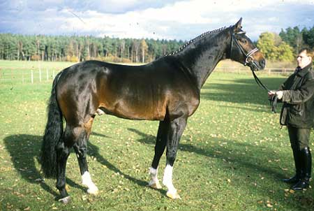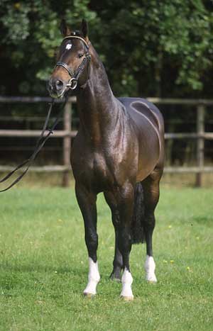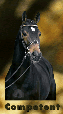 Here the name is also the programme: Competent is a real "jack of all trades". Highly elastic in the three basic gaits. Added to that, an astonishing manner of locomotion via leaps and bounds. He absolved the 2000 stallion performance test in Neustadt/Dosse as one of the best stallions of an age class numbering 51 contenders, in Performance class I. He was especially brilliant in jumping, in which he attained the highest of scores. Competent is the first of meanwhile several approved sons of the highly esteemed Compliment and along with Glückspilz, Graphit and Gotthard, carries an agglomeration of the G-blood on the maternal side of the pedigree, which is so invaluable for Hanoverian horse breeding. Earlier generations of his ancestry include the East Prussian impressed stallions Landherr and Keith, who were very popular sires of riding horses in their day. The dam Gescha produced the one year younger approved full-brother Campo Grande who is being used as a stud horse in Hessia and Baden-Württemberg in the same mating combination. The highly valued Moritzburg state stallion Accuse is also closely related. The dam-line is identical in origin with that of the renown stallions Sigesmund (private stallion Oldenburg) and Wulf (Celle state stallion). It is anticipated that Competent will pass on his great predisposition for sport and his brilliant type to his progeny.