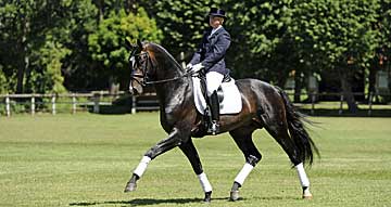 De Champ, dark bay Oldenburger Stallion, by (Daddy Cool / Caprimond) born in 2006, standing approximately 16.3 1/2 hands. A modern dressage stallion with top scores in his 30 day test This stallion is an impressive looking fellow with obvious Trakehner refinement and the typical excellent movement qualities of the Donnerhall line. At his 30 day test in Neustadt/Dosse in 2010, De Champ was awarded the excellent scores of 9.0 for walk, 9.0 for trot and 9.5 for rideability. He completed the test with a top overall dressage-oriented score of 8.93 before embarking on a very successful first competition season which brought him wins and high places in conformation classes and novice dressage horse classes. De Champ is an elegant, long-legged stallion with three excellent paces. Sire, Daddy Cool, was Oldenburg Regional Champion in 2006, qualified for the Bundeschampionat in 2007 and is now at Isabell Werth's yard being prepared for more advanced dressage competitions. Daddy Cool's sire, Don Davidoff, was a resplendent Bundeschampion and World Champion of Young Dressage Horses. One of his offspring, Don Auriello, has already won six advanced level dressage classes. Maternal grandsire Caprimond has proven excellent breeding qualities and he has founded his own stallion dynasty via Hohenstein and Münchhausen. A 15-times advanced dressage class winner, he was still competing in Grand Prix classes at the age of 19 and now has elite stallion status. His progeny have already earned a total of over EUR 300,000 in competition winnings. Argentan, three generations removed, produced international-calibre stallion Argentinus. De Champ is descended from the Hofmagd bloodline, which has also produced approved stallions Provider, First Pleasure, Airport, Flennegen, Wettiner, Williams Boy and advanced show jumping stallion, Cashman. De Champ is an elegant and noble stallion with an athletic build