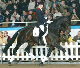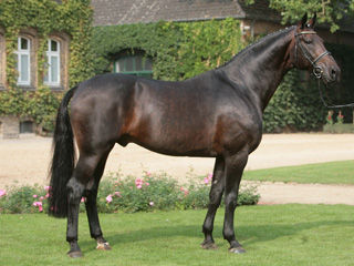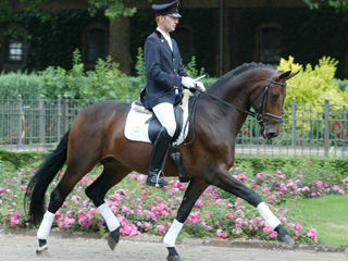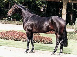 Don Bedo, bay Westphalian Stallion, by (Donnerhall / Rosenkavalier ) born in 1996, standing approximately 16.3 The Westfalian licensed stallion Don Bedo has passed away. The dark bay stallion by Donnerhall out of State Premium Mare Rosita (by Rosenkavalier x Apart x Cyrus) was humanely put down. Bred by Maria Bergjohann from Dülmen, Don Bedo was only 12-years old. Don Bedo was the champion of the 1998 Stallion Licensing and passed his performance test with an overall score of 119,05. He placed fourth out of eighteen stallions and finished second in dressage with a score of 131,87. Don Bedo produced 25 state premium mares and has 158 offspring registered as sport horse. His most famous son was the champion of the 2003 Westfalian licensing, Dancing Dynamite (out of Florin by Fidermark I x Worldchamp). Don Bedo I was trained to S level in dressage and has a licensed fullbrother Don Bedo II. The Landgestut Warendorf dealt with several deaths recently. The old-timers Prestige xx and the 1980 Licensing champion Weltruf (by Windesi xx) passed away. Precioso (by Pit I) also died. Photo courtesy: Landgestut Warendorf Don Bedo is captivating in profile with first class basic gaits. Sired by Donnerhall, one of the worlds great dressage stallions. His dam is sired by Rosenkavalier, the sire of another great stallion, Rubinstein I and her dam is by the prepotent and important Thoroughbred producer, Angelo xx. Don Bedo won the NRW stallion championship and later placed second at his 100 day test in dressage against and extremely strong group of stallions. He impressed with his high rideability and ultimate elegance. He received a 9.25 on his walk, 9.25 on his canter and a 8.75 on his trot. His first year at stud produced excellent foals.