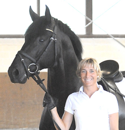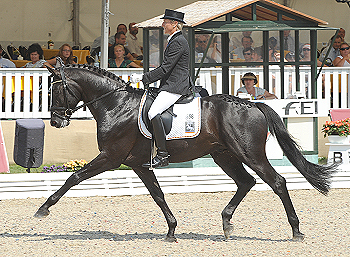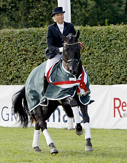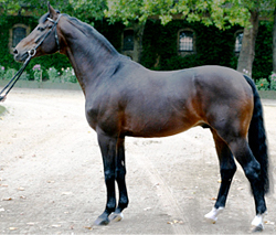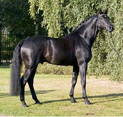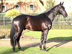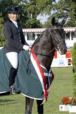 stallion.... Shown with rider Ingrid Klimke. He is a son of the brilliant competition stallion, DRESEMANN (Daidalos - Wolkenstein II). (Dresemann was 3 y.o. Bundeschampion in 2002, receiving the highest scores ever to date with two 10s from guest riders). Dresemann Through Daidalos (dressage breeding value 152) and Dream of Glory (winner of S level dressage competitions in Germany), DRESDEN MANN carries the blood of the legendary Donnerhall. His Dam Floh is a daughter of the important Warendorf sire FLORESTAN I. Sire of dam Elmshorn (ex Lorvado) by Lord won the stallion performance test in Warendorf in 1989 (total index 135.29). The dam Loretta competed successfully in jumping competitions. Further on in the dam’s pedigree, the Trakehner Doruto and the thoroughbred Abendfrieden appear who produced the outstanding sires Manometer xx, Perser xx, Pik As xx and Pindar xx, all of which played a role in different warmblood studbooks. His rider, Ingrid Klimke, has this to say : "Dresden Mann is a beautiful black stallion, a brilliant uphill horse, with a great gallop and dynamic movement. In training he is always motivated and ready to learn, so that the daily work is always a pleasure. After his breeding season at the NRW Landgestuet he came to my stable in mid-September 2008. With his sweet personality and wonderful manners he quickly became a favorite in the barn. At his first competition with me he convincingly won the Dressage Horse "A" class with a mark of 8.8, far ahead the rest of the horses. In December 2008 he already had success at the "L" division, easily winning his first class at that level." At 165 cm (16.1) he is another "refiner" that I have been looking for. He brings interesting Blood, lovely type, excellent temperament and great willingness to work. Info
