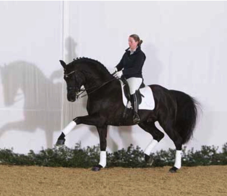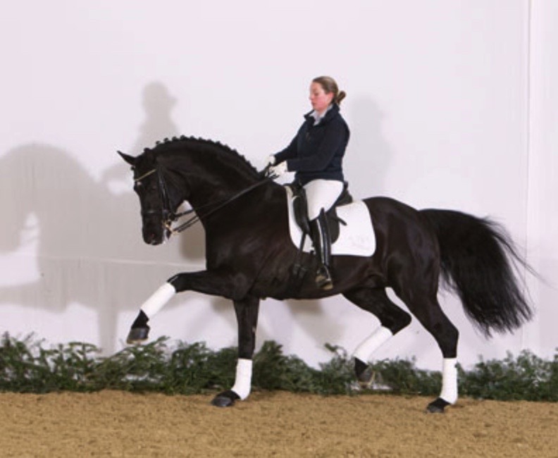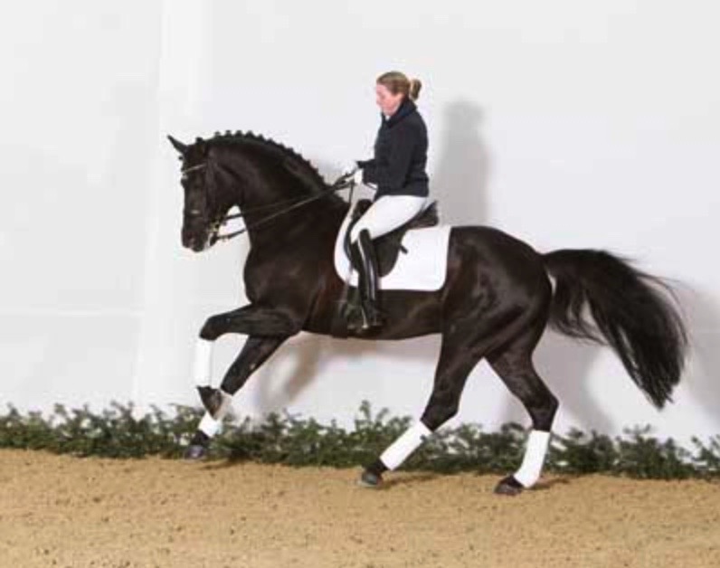 Bundeschampion Dresemann, black Hanoverian Stallion, by Daidalos / Wolkenstein II born in 2004, standing approximately 16.2 hands. Pitch black dance master, with fascinating in and exterior. Elegant gentleman, with an near unmatched movement. His bloodlines combine the famous Donnerhall and Weltmeyer lines, the most influential and important genes of the presence. The black sire Daidalos was Landesrididinghorse Champion in Hanover/Bremen. He was successful in Dressage classes, winning under Heiner Schiergen all the way to the Bundeschampionat. Dresemann was the sensation at the Bundeschampionat 2002: Dresemann was under Elisabeth Niehues-Rembeck and a sight that will be unforgettable. He qualified already with the highest scores of 8.8 and it was obvious, that he would be in the finale. This dream in black, got the highest scores ever given out at the Bundeschamiopnat by the guest riders and was totally the sensation of the year: - Trot 10,0 - Canter 10,0 - Walk 8,5 - Conformation 9,5 - Overall Impression 9,5 - Guest Rider I 10,0 - Guest Rider II 10,0 After this perfect performance, he was named Bundeschampion of the 3 year old riding horse stallions, with a total of 67.5, followed by 2nd place with 63. What an obvious victory that was. His dam St. Pr. St. Whitney had a stellar mare performance test. Dam sire Wolkenstein II was the Bundeschampion and stallion performance test winner. His breeding index is the most successful of all Weltmeyer sons. The picture perfect beautiful black Dresemann in third Generation was educated up to Grand Prix and a very highly sought after stallion in Celle as well as in France. The grand dam Gina is a sister to the famous Dillenburg stallion Grafenberg. Via Grenadier, Lugano I, Wöhler, Poet xx, Jason ox, he has the best genes you could be looking for. Keuring in NRW December Münster Handorf. This stellar stallion came in with a score of 8.33 as 3rd place out of 33 participants. His ride ability, trot and canter, were 1st place, no doubt. In the year 2003, he was victorious in many dressage horse classes. In 2004, Dresemann participated at the world young horse championships in Verden as well as being in the finale of the Bundeschampionat 5 year olds. In 2005 as well, Dreseman was able to continue his successful career, finale of the world championships of the young dressage horses in Verden as well as finale of the Bundeschampionships for 6 year old dressage horses. Until today, Dreseman is highly placed all the way up to dressage horse classes Intermediare I. In 2007, his breeding index of 160 was one of the best in the riding horse books. In the meantime he was trained all the way to Grand Prix, there is no limit to what this horse can do. Lackschwarzer Tanzmeister in faszinierender Gesamtaufmachung. Souverän im Auftreten, ausstaffiert mit einem Bewegungsarrangement, das seinesgleichen sucht. In seiner Abstammung verbinden sich über Donnerhall und Weltmeyer die tragenden Dressurlinien der Gegenwart: Der rappfarbene Vater Daidalos war Landes-Reitpferdechampion von Hannover-Bremen. Er hat Dressurpferdeprüfungen der Klassen L und M gewonnen und war unter Heiner Schiergen erfolgreich bis zum Bundeschampionat. DRESEMANN sorgte für die Sensation auf dem Bundeschampionat 2002: DRESEMAN, wurde 2002 auf dem Bundeschampionat für 3-jährige Reitpferdehengste von seiner Reiterin Elisabeth Niehues-Rembeck vorstellt und zeigte bereits in der Qualifikation in der er die Wertnote 8,8 erhielt, daß mit Ihm im Finale zu rechnen ist. Der "Traum in Schwarz" erhielt von der Richtergruppe und den Fremdreitern im Finale die "Höchsten" jemals beim Bundeschampionat vergebenen Noten und sorgte somit für die Sensation des Jahres! - Trab 10,0 - Galopp 10,0 - Schritt 8,5 - Gebäude 9,5 - Gesamteindruck 9,5 - Fremdreiter I 10,0 - Fremdreiter II 10,0 DRESEMANN, der von Elisabeth Niehues Rembeck perfekt vorgestellt wurde, wurde Bundeschampion der 3-jährigen Reitpferdehengste mit der Notensumme 67,50 vor dem Zweitplacierten in dieser Prüfung mit der Summe 63,00. Die Mutter St. Pr. St. Whitney absolvierte eine erstklassige Stutenleistungsprüfung. Muttervater Wolkenstein II war selbst Bundeschampion und HLP-Sieger. Er gilt unter den Weltmeyer-Söhnen als der züchterisch profilierteste. Der strahlend schöne Rappe Dressman in dritter Generation war selbst ausgebildet bis Grand Prix und ist nach Landbeschälerdiensten in Celle und Zweibrücken heute ein gefragter Beschäler in Frankreich. Die Urgroßmutter Gina ist rechte Schwester des geschätzten Dillenburger Landbeschälers Grafenberg. Über Grenadier, Lugano I, Wöhler, Poet xx, Jason ox ist dieser Junghengst auch in den hinteren Generationen geradezu erstklassig gezogen. Aus dieser Mutterlinie der Stammstute Felsenhaupt (v. Feiner Kerl-Aconit usw.), die schon über Jahrzehnte im Hause Döscher-Altenbruch gepflegt wird, gingen auch die bekannten Vererber Asket und Einklang (beide Ldb. Schwaiganger), Duktus, Einblick, Rosentau, Senior, Weinschenk und Wintertag (alle Ldb. Celle), Escort (Belgien), Hanson (Ldb. Dillenburg), Landjäger (Ldb. Marbach) und Lanthan (PB Westf.). Gekört NRW Hauptkörung Dezember 2001 Münster Handorf. Der Strahlemann absolvierte seinen 30 – Tage Test in Münster Handorf mit der Gesamtnote 8,33 als Dritter der 33 Prüfungsteilnehmer. In den Teilbereichen Rittigkeit, Trab, Galopp belegte der den 1. Platz. Im Jahr 2003 begeisterte der Strahlemann mit überlegenen Siegen in Dressurpferdeprüfungen. 2004 war Dresemann Teilnehmer an der Weltmeisterschaft der jungen Dressurpferde in Verden, sowie Finalteilnehmer beim Bundeschampionat des 5 j. Dressurpferdes. Auch in 2005 belegte Dresemann hervorragende Plätze im Finale der Weltmeisterschaft der jungen Dressurpferde in Verden sowie im Finale des Bundeschampionats des 6. jährigen Dressurpferdes. Bis heute ist Dresemann hochplaciert bis hin zu Dressurprüfungen Intermediare I. In 2007 gehört Dresemann nach integrierter Zuchtwertschätzung mit einem Zu