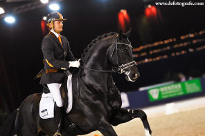 Hengelo: President's Jack Sparrow pakt eerste zege! 30/11/2011 Johnson-zoon Jack Sparrow werd vorige week tijdens de eerste bezichtiging van het KWPN aangewezen voor het hengstencompetitie-traject. Precies een week later wist de stoere zwarte al de winst in de eerste competitiewedstrijd op te eisen. Onder het zadel van Edward Gal liep de hengst van de President Stables woensdag in Hengelo naar een knappe score van 85 punten, waarmee hij in de L-rubriek ruimschoots de winnaar was. Edward Gal kwam lachend de ring uit: “Ik ben hier heel blij mee, maar ook al was Jack Sparrow bij wijze van spreken ontploft; dan was ik nog blij geweest. Ik weet op wat voor paard ik zit en het is een paard met ontzettend veel kwaliteit. Ik heb echt het gevoel dat ik over een paar jaar met een knipoog aan kan piafferen.” Jack Sparrow bleef in de L-rubriek voor op KWPN-hengst Chippendale (Lord Leatherdale x Negro) onder het zadel van Severo Jurado Lopez en de in Oldenburg goedgekeurde Chicago MH (Vivaldi x Montecristo), die werd voorgesteld door Jonna Schelstraete. President Jack Sparrow door naar 2de bezichtiging! 24/11/2011 Gisteren, na de eindpresentatie van de hengsten in het verrichtingsonderzoek, vond de eerste bezichtiging plaats voor hengsten geboren in 2008 en eerder. President Jack Sparrow (Johnson x Wolkentanz II x Don Primero) heeft hieraan succesvol deelgenomen onder zijn ruiter Edward Gal en is uitgenodigd voor de tweede bezichtiging. Voor deze hengst houdt de tweede bezichtiging in dat moet worden deelgenomen aan de Hengstencompetitie. Na de competitie besluit de GMB KNHS/KWPN Hengstenkeuringscommissie of de hengst aangewezen wordt voor de derde bezichtiging.