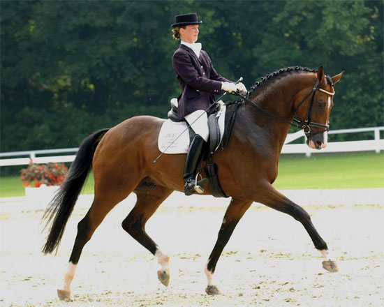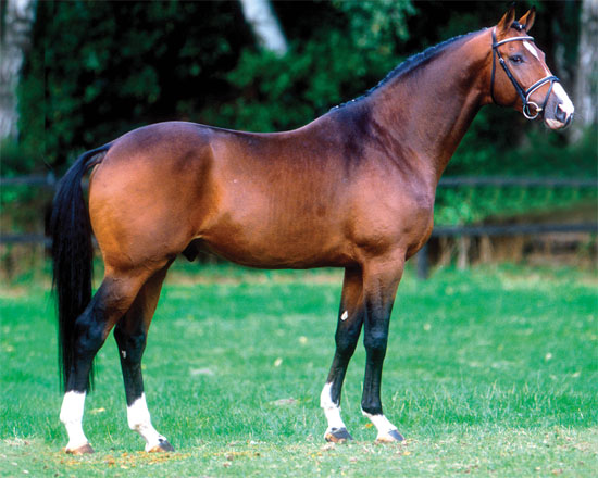 Laurentino, bay Hanoverian Stallion by (Lauries Crusador xx / SPS Wyella [Wanderbursch II]), born in 1999, standing approximately 16.3 hands. Laurentino is approved in the following registries: Hanoverian, Oldenburg, Rheinland, Westfalen and Denmark. Laurentino passed his 30 day test and was Reserve Champion for rideability, scoring an 8.65. Laurentino has extraordinarily dynamic movements and a wonderful disposition. He is by the famous Thoroughbred stallion, Lauries Crusador xx, who is regarded as one of the best Hanoverian approved Thoroughbred stallions. His dam, SPS Wyella, was Champion mare at the 1995 Louis-Wiegels mare show.