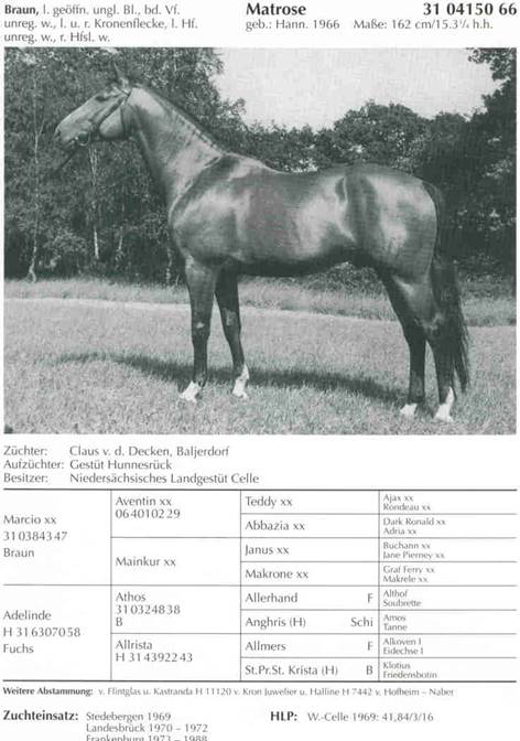 Matrose has produced many FEI level competition horses including well known dressage stallions such as Manstien, Matador, Magnum and Mattgold