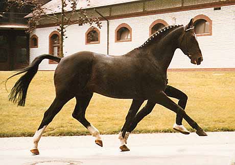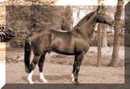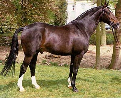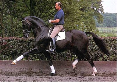 Pik Bube’s dam, Franka also produced the full-brother, Pik Bube II and the advanced dressage horse, Poseidon 30. Her dam, Dohlenfurstin, was an international showjumper under the name Daniela. Dohlenfurstin is also the dam of Grand Prix showjumper, Prince Charming. Franka is by Frustra II was a crucially important dam sire in the Hanoverian studbook, stallions such as Donkosak, Drosselklang I & II, Goldfalk, Graphit, Gralsritter, Imperial, Löwenstein, Piaff, Wachmann I & II, Webefunk, and many more, were out of mares by Frustra II. Pik Bube I sired performers in all disciplines. His daughter, Pikantje was Federal German riding horse champion of 1981, and Pik Bube’s Girl won the 1990 Federal Mare Show in Verden. Pik Primaire, Pik Royal were amongst the 49 of his offspring that were successful in advanced dressage, while 19 showjumpers achieved advanced level. Perhaps the most successful of his stallion sons has been Piaster who stands in Bavaria, Pik Labonics has been a successful sire for the Westfaliens, and Pommery has produced some useful progeny in Hanover. His son, Pik Noir competed successfully in dressage and was the sire of Prinz Paul, who placed 3rd in the six year old Dressage Championship at the 2001 Bundeschampionate. As a brood mare sire, Pik Bube has been a phenomenon, especially when teamed with Donnerhall: Davignon, Don Primero, Don Schufro, Donatelli, Donnerbube, Dream of Glory, Duntroon - all bred on that magic cross Donnerhall/Pik Bube. Pik Bube was himself a successful sire in his own right, but more importantly he became one half of the magic equation: Donnerhall x Pik Bube - for the overwhelming majority of successful Donnerhall progeny are out of mares by Pik Bube. It was a great surprise when the head of the State Stud Celle, Christian von Steglin failed to include Pik Bube in the ‘Celle Lot’ (the state stud director has first pick of the successful young stallions) and let him go to the glamorous Grönwohldhof studfarm - where he formed a hugely successful partnership with resident trainer, Herbert Rehbein. They won 11 out of 12 advanced classes in their only competition season in 1980. Pik Bube’s sire, Pik König is considered the most important son of the famous Thoroughbred sire of showjumpers, Pik As xx. Pik König sired 19 Approved sons and 22 State Premium mares. His offspring - such as Pirol 37 - were mainly successful in showjumping. With a dressage index of 126, and a jumping index of 131, Pik König had an overall rating of 129. His sire, Pik As xx stood at the State Stud Celle from 1953-69, where he sired four approved sons.ight of his powers, at the age of 18, Pik Bube suddenly broke down under his rider and died almost immediately - his was a great loss. gekörte Söhne: Als Otto Schulte-Frohlinde sich Mitte der 70er Jahre entschloss, einen Hannoveranerhengst auf seinem Grönwohldhof zu stationieren, fiel seine Wahl auf den schwarzbraunen Pik Bube I. So recht hatte keiner verstanden, warum der damalige Celler Landstallmeister Dr. Christian Freiherr von Stenglin den antrittsstarken Schwarzbraunen nicht für das "Celler Lot" gefesselt hatte. Pik Bube I legte den Grundstein für die heute europa- und weltweit bekannte Hengsthaltung auf dem Grönwohldhof, der in Schleswig-Holstein unweit von Hamburg liegt. Pik Bube I entstammte dem ersten Fohlenjahrgang des Pik König, seine Mutter Franka war eine Tochter des Frustra II, der in ungewöhnlich intensiver Weise als Muttervater bedeutender Leistungsvererber eine Sonderstellung in der hannoverschen Zucht einnahm. Spitzenhengste wie Donkosak, Drosselklang I und II, Goldfalk, Graphit, Gralsritter, Imperial, Löwenstein, Piaff, Wachmann I und II, Werbefunk und viele andere stammten aus Frustra II-Müttern. Pik Bube I absolvierte die Hengstleistungsprüfung als Reservesieger und machte den Grönwohldhof zu einem Wallfahrtsort für Züchter aller Verbände. Alle wollten das Wunder sehen, das dort geschah. Der trittgewaltige Schwarzbraune gedieh unter Herbert Rehbein zu einem Dressurpferd der Extraklasse. 1980, in ihrer einzigen Turniersaison, waren sie bei zwölf Starts in Klasse S elfmal Sieger. In seiner Vererbung blieb er indessen nicht auf eine Disziplin fixiert und setzte in vielerlei Belangen Akzente. So war die Tochter Pikantje 1981 Bundeschampionesse des Deutschen Reitpferdes, Pik Bubes Girl 1990 Siegerin der Bundesstutenschau in Verden. Im Viereck machten Pik Primaire, Pik Royal und zahlreiche weitere Karriere. 49 seiner Kinder gingen erfolgreich schwere Dressuren, 19 Springpferde verzeichneten S-Platzierungen im Parcours. Diese Vielseitigkeit in der Vererbung zeichnete auch seinen zwei Jahre jüngeren Bruder Pik Bube II aus, der Landbeschäler in Celle war und immer etwas im Schatten des älteren stand. Von den Hengstsöhnen haben sich der in Bayern eingesetzte Piaster, ferner Pik Labionics, Pik Noir, Pik Senior, Pik Solo, Placido, Plaisir d'Amour und auch Prinz Miro deutlich profilieren können. Mit 18 Jahren trat Pik Bube I im September 1991 völlig überraschend von der züchterischen Bühne ab. Der stets vitale Beschäler brach beim Training unter dem Reiter plötzlich zusammen und war nur wenige Augenblicke später tot. Er war einer der bedeutendsten Privathengste mit hannoverschem Brand.
