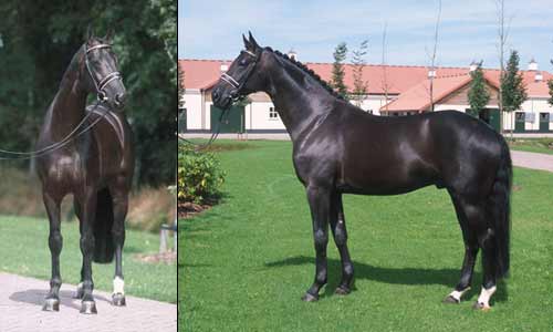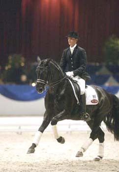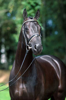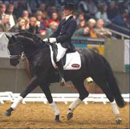Ronaldo, black KWPN Stallion, by (Rubinstein I / Ramino [Ramiro Z]) born in 1995, standing approximately 16.2-1/2 hands. Magic Ronaldo is sired by the legendary black foundation stallion, Rubinstein I, who performed at international level in dressage, and who originates from the same line as the Olympic Champion Rembrandt. He has sired over 80 approved stallions, among which Rohdiamant, Rubinus, and Magic Ronaldo. Magic Ronaldo's dam, the State Premium mare Carella, originates from one of the best maternal lines of Oldenburg. She also produced the approved stallion Rubin Star N, who won in 1994 the Hengstleistungsprüfung in Munchen-Riem , and the mare, Rendezvous, who won the Bundeschampionat for four year old mares. Magic Ronaldo was champion of the stallion shows in Oldenburg in 1997. In 1999 he did a fantastic performance test in Neustadt-Dosse, with 10's for canter, and character. In 1999 he became reserve champion of Oldenburg based on his performance and progeny. In the Netherlands, Magic Ronaldo was successful in the Stallion Competition of 2000 and 2001. The KWPN was very positive about his progeny, who are very sought after at auction and yielded high prices. Magic Ronaldo is currently being trained by Edward Gal for the Light Tour. Stallion Performance Test Walk: 6.5