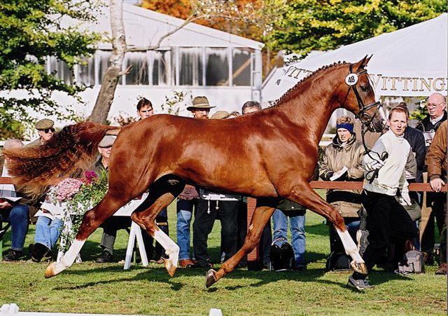 Royal Blend, chestnut Stallion , standing approximately 16.2 hands. Royal Blend won the 2005 Burchard-M¸ller Prize as Best Young Stallion. The elegant stallion was also Reserve Champion of the 2004 Stallion Performance Test with excellent marks in all areas, including 9's for character, performance ability and rideability as well as exceptional gait scores. SPT: overall: 137.31 (2); dressage: 137.31 (2); jumping: 107.19 (13)