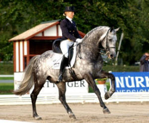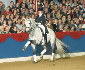 hands. Royal Diamond, Rohdiamant's full brother, is an ideal type who is simply riveting. Model movement, quality, and rideability leave nothing to be desired. This is the family of the mare Elektia, famous for the Champion Mare at the 1984 Schau der Besten, Arabella Queen (by Admirand), various auction horses, the sport horses Let´s Dance (by Last Trump xx), Ramino (by Ramiro), Zermatt (by Zeus) and the approved stallion, Creskando (by Corlando). 1996-- highly placed in the premium ring in Oldenburg. Royal Diamond finished his performance test in Neustadt/Dosse as the clear winner with a score of 140.65 (dressage 150.93 points. In 1997 he was hands-down winner of the performance test in Neustadt/Dosse with a score of 140.65 points (dressage 150.93). In 1998 he was Vice State Riding Horse Champion and series winner in elementary dressage horse tests and Reserve Champion Stallion at the Main Premium in Oldenburg. Royal Diamond was 1999's Vice Champion of five year old dressage horses. Royal Discovery, (€ 115,041.00) was the top priced horse at the 2001 Vechta Fall Auction. In 2002 Royal Diamond had four State Premium mares and four approved stallions. His son, Royaldik, won the stallion performance test in Neustadt/Dosse. He had 31 successful competition offspring. Royal Patina, was winner of three year old Filly Materiale and Fillies under Saddle classes in Devon/USA. Royal Diamond himself won € 13,328.00 in St. George and Intermédiare I in Germany. He was awarded the title of Promising Stallion at CDI*** in Zwolle, Netherlands. In 2004 Royal Diamond offspring, Revolution (dam by Furioso II), was the Champion of the National Dressage championships in the six year old class at the Kentucky Horse Park, USA. Royal Diamond himself won and placed in Grand Prix. His star continues to ascend. In 2005 he qualified for the Bundeschampionat in the class for six year old horses and many first and other places in dressage horse tests at elementary and medium level. In 2005, Royal Diamond received a Breeding Value Index of 156 points, with an assurance of 96% heritability, from the German Equestrian Federation. Royal Diamond offspring are known to excel at piaffe and passage. Hi daughter, Rubina (Royal Diamond-Dunhill H), became Bundeschampion of 3-year olds in Austria. Rustin Man (Royal Diamond-Figaro) became State Champion in the class for 5-year old dressage horses in Rastede. In 2006, Rubina won again, this time in the class for 4-year old mares at the National Young Broodmare Show in Austria. Royal Deniro (Royal Diamond-De Niro) became Vice State Champion of 3-year old dressage horses and then sold for 320,000 EURO – the highest priced horse at the 65th Elite Auction. Royal Concert (Royal Diamond- Continue) was the second most expensive riding horse, bringing 172,000 EURO. Royal Diamond took the Vice State Champion title with Tanja Lammers at the Weser-Ems Championships. In the USA, Royal Diamond is represented by many award-winning dressage horses with the utmost rideability.