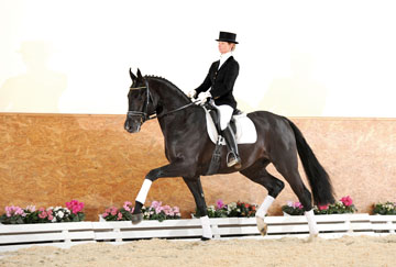 Surprice black Oldenburg Stallion (Sir Donnerhall / Prince Thatch xx [Watzmann]) born in 2007, standing approximately 17 hands. A modern, jet black stallion with a priceless combination of genes from Sir Donnerhall and thoroughbred sire, Prince Thatch xx, on the dam's side. At the Oldenburg licensing he was still relatively undeveloped and demonstrated many of the dam's sire, Prince Thatch xx's characteristics. Now, this relatively late-born black stallion is exhibiting an exceptional talent for dressage under the saddle. His popularity stems from his fascinating presence, energetic forward movement, excellent walk and flowing uphill canter. Surprice has an ingenious gene pool. His sire, Sir Donnerhall, is one of the leading modern-day dressage stallions who continually produces top competition and breeding offspring. In 2009, he produced the North Rhine-Westphalian champion stallion Silbermond, and his daughter Schickeria sold for the highest price of EUR 355,000 at the Handorf Auction in 2008. Maternal grandsire, Prince Thatch xx, is considered to be a supreme breeding stallion and has sired many internationally successful dressage horses, such as World Championship team gold winner Piccolino/Husenbeth and World Championship competitor Petit Prince/Joelle Beier. His offspring have accumulated over EUR 590,000 in lifetime earnings. This stallion's impressive pedigree goes back to the successful stallion, Wöhler, a genuine high-performance Hanoverian sire who is featured in the pedigrees of many other successful competition horses. Surprice descends from the successful dam line of Feiereiche, which has produced numerous advanced level dressage horses. Surprice is a long-legged stallion with a refined modern pedigree who is destined to be a champion.