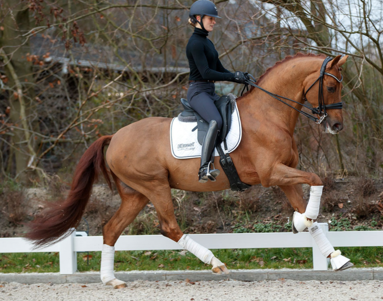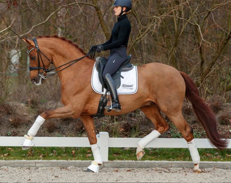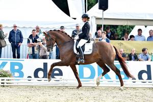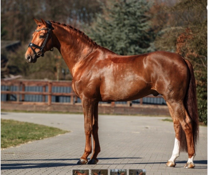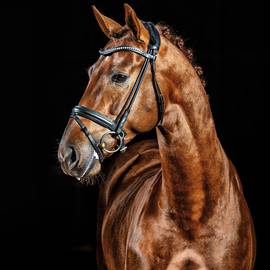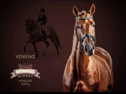 Veneno, liver chestnut Westphalian Stallion, by (Vitalis/Diamond Hit) born in 2011, standing approximately 16.2 hands. Veneno HC - a dressage sire with exceptional style and expertise. The dark chestnut stallion won the bronze medal at Westphalian championships in Muenster-Handorf, where he obtained the mark very good plus (9.5) for his trot and a clear very good (9.0) for his canter. Afterwards he entered the final at National Championships. Veneno HC satisfied the judges in his three gates and his exemplary rideability in his 30-days-test in 2015 in Schlieckau, too. The father Vitalis became reserve-victory in 2009 in Westphalia, placed in the WC of young dressage horses in 2013 and won Inter I- dressage competitions as a seven-years-old. With an index of 158 he belongs to the top first percent of German sires and he can already offer a range of licensed sons. Vitalis' sons are especially attractive. Veneno has what it takes to also be an important sire, because even on the maternal side his pedigree has much to offer. His mother, St.Pr.St. Diamond Lady previously brought forth seven children and all of them are very successful and promising. Her first offspring was awarded the title of state premium mare and was sold to South Germany. The dam's sire Diamond Hit is victorious up to Grand Prix level. The great-grandfather is the trademark stallion Landadel. With his quality pedigree, Veneno HC is a strong contender for future breeding and is now available through Waterview Park.