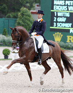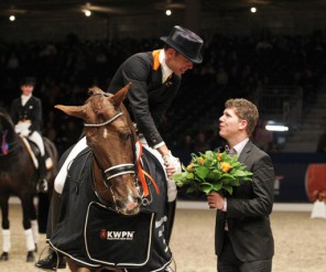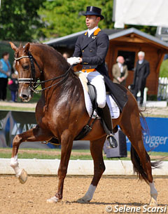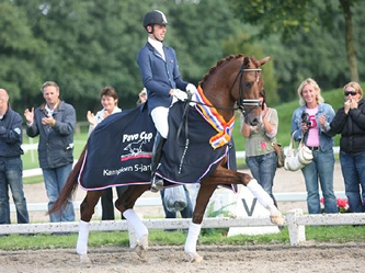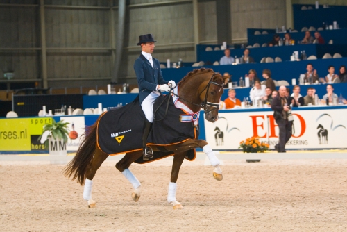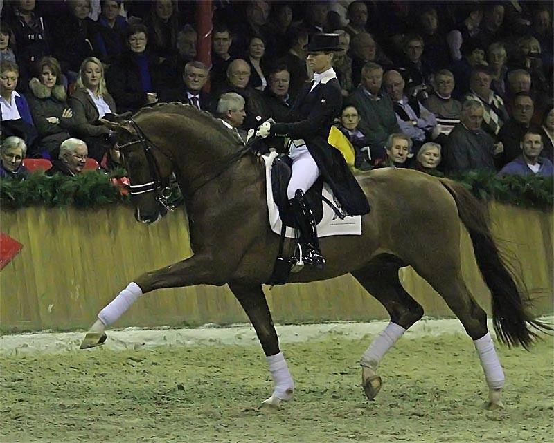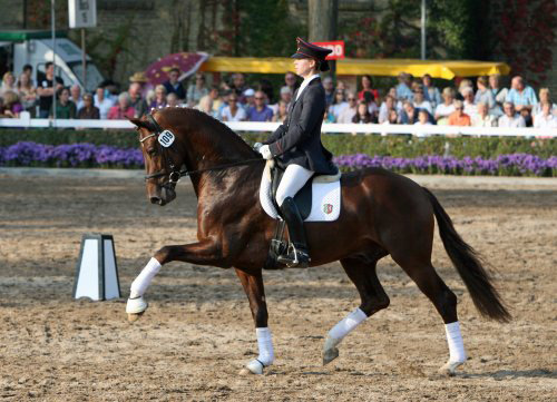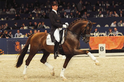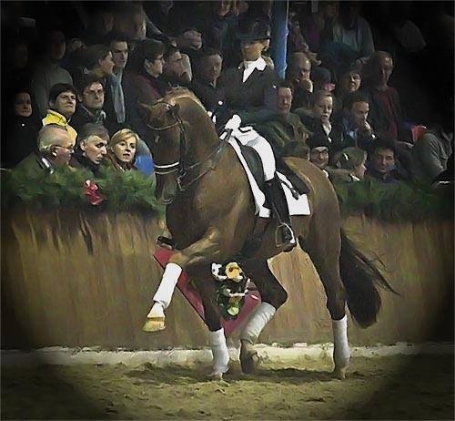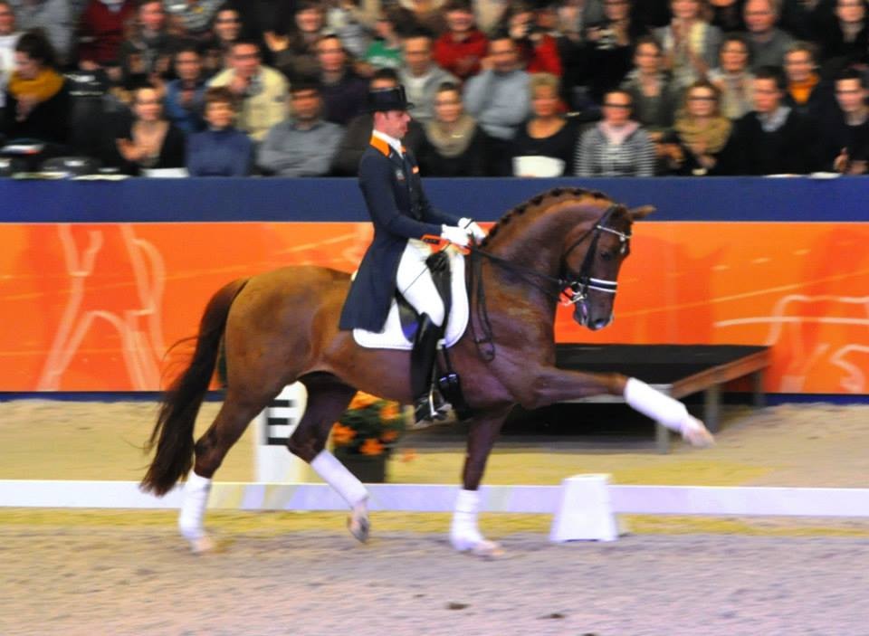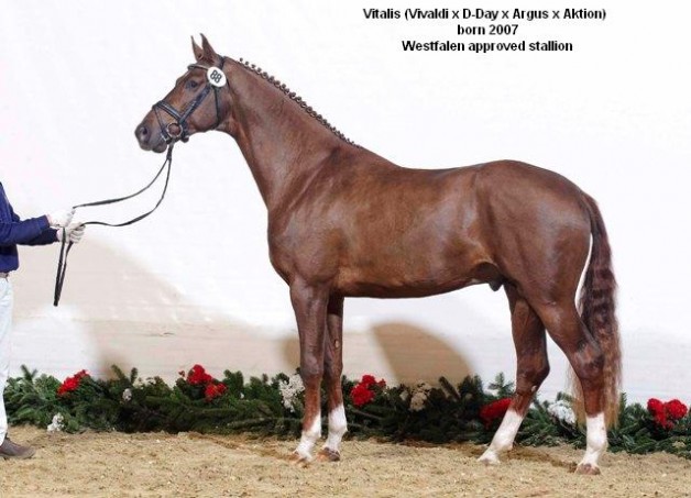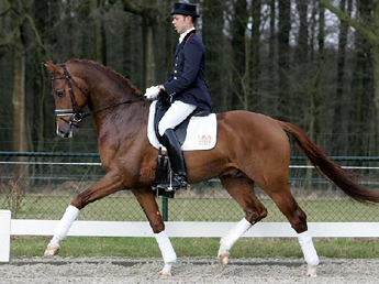 Vivaldi, chestnut Dutch Warmblood Stallion, by (Krack C / Jazz prf) born in 2002, standing approximately 16.3 hands. Vivaldi presents a well-built and developed riding horse type with a good rectangular frame. His uphill conformation is highlighted by an especially appealing front end--he has inherited the amazing forearm elevation and extension of his illustrious sire, Krack C. Vivaldi is an honest and reliable stallion with a very good attitude and a great willingness to work, possessing a compliant temperament. His walk is correct, spacious and supple; the trot is spacious, well carried, and supple with a good foreleg technique; the hindleg is actively bent and carried well underneath; the canter is spacious and uphill. As a dressage horse Vivaldi exhibits extreme natural ability and gives his rider a very good feeling. As a performance horse, Vivaldi is well on his way to a stanout career. As a still-young horse he was fourth place in the first day of the Pavo cup for 4 year-old dressage horses, 2005. In 2007 he was Champion of the Pavo cup for 5 year-old dressage horses. (Guest riders Carl Hester and Seth Bosman, gave Vivaldi the maximum of 100 points.) In 2007 Vivaldi achieved first place in the Stallion Competition Hengelo, 2007/2008. From his first crops of foals Vivaldi clearly transmits his quality to his offspring, which is backed up by his KWPN offspring report: "A very uniform collection of well developed, riding type foals with a lot of presence and a good rectangular model. The foals move with a good leg technique, suppleness and carry themselves well. That Vivaldi n is fully worthy of his foal report is further substantiated by the fact that in 2007 he had, no less than 3 foals placed in the Championships at the National Foal Show, where, ultimately one of his foals became National Champion. The other foals held fourth and eighth place respectively.