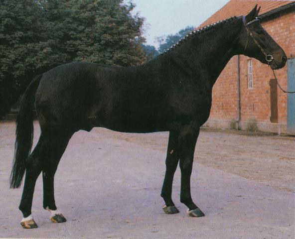 Weltmeister, black/brown Hanoverian Stallion, by (Wedekind / Don Carlos) born in 1973, standing approximately 16.3 hands.