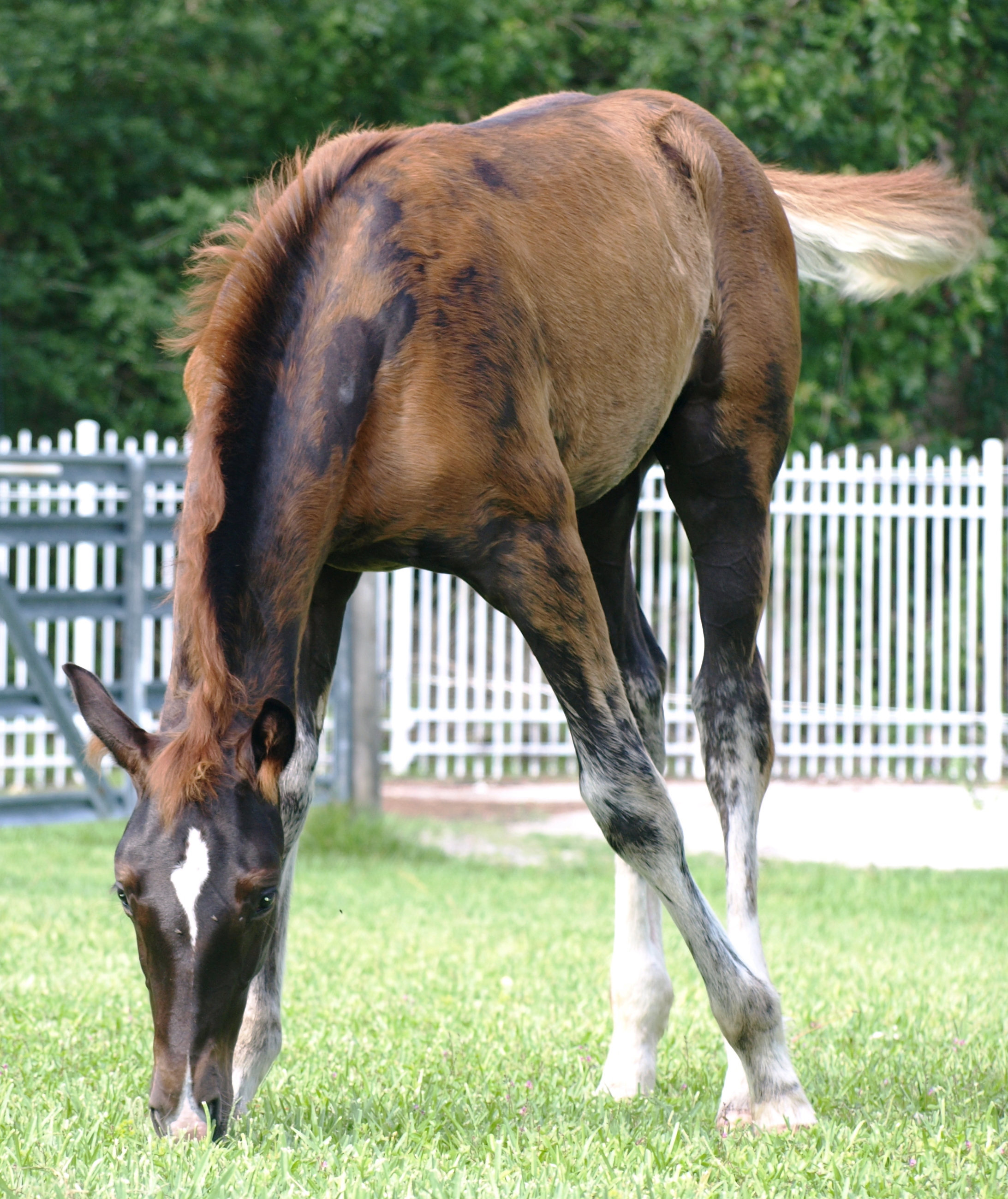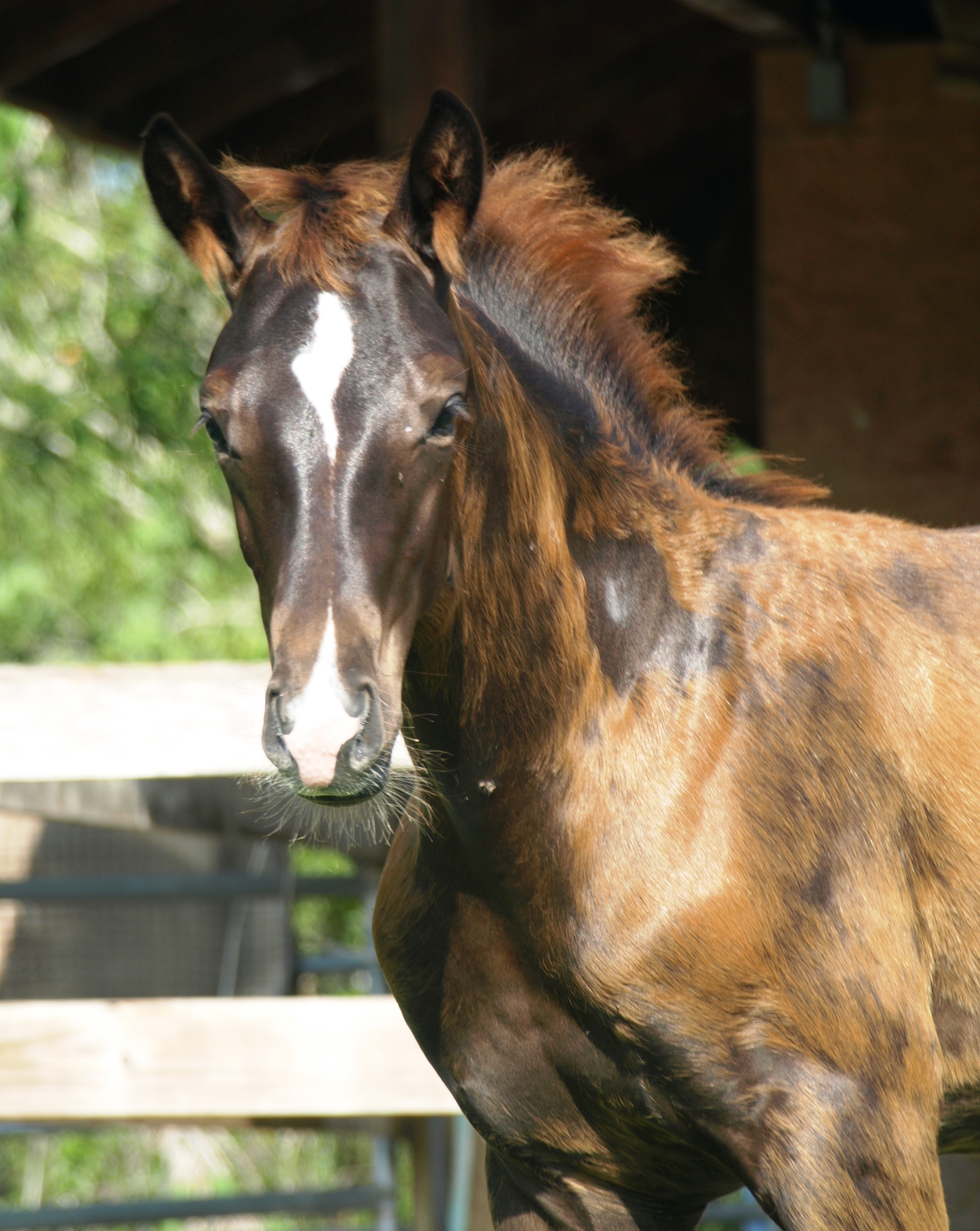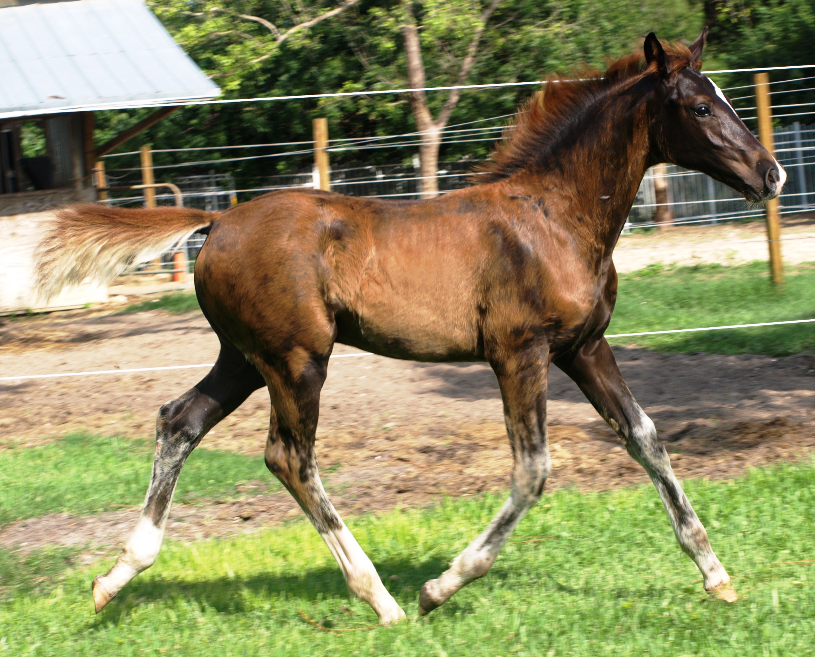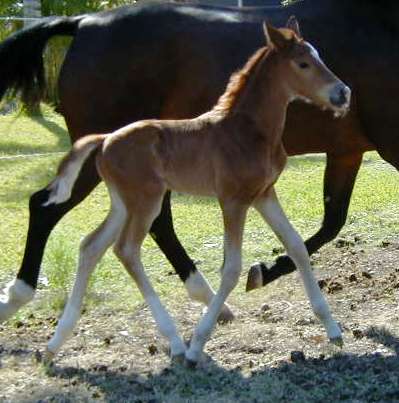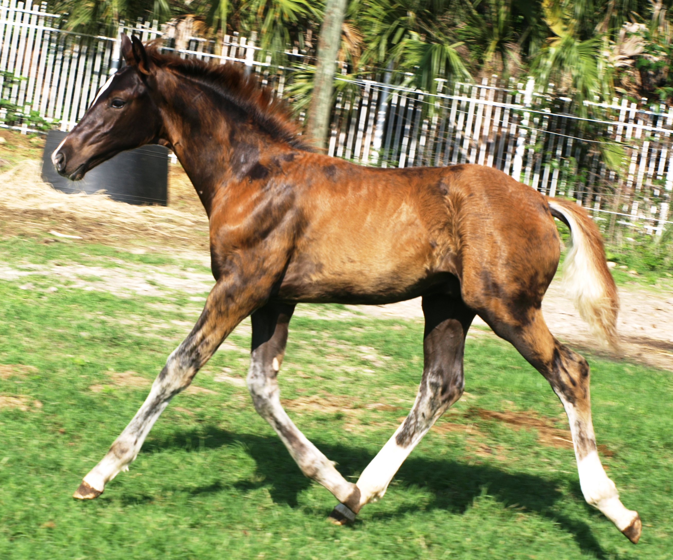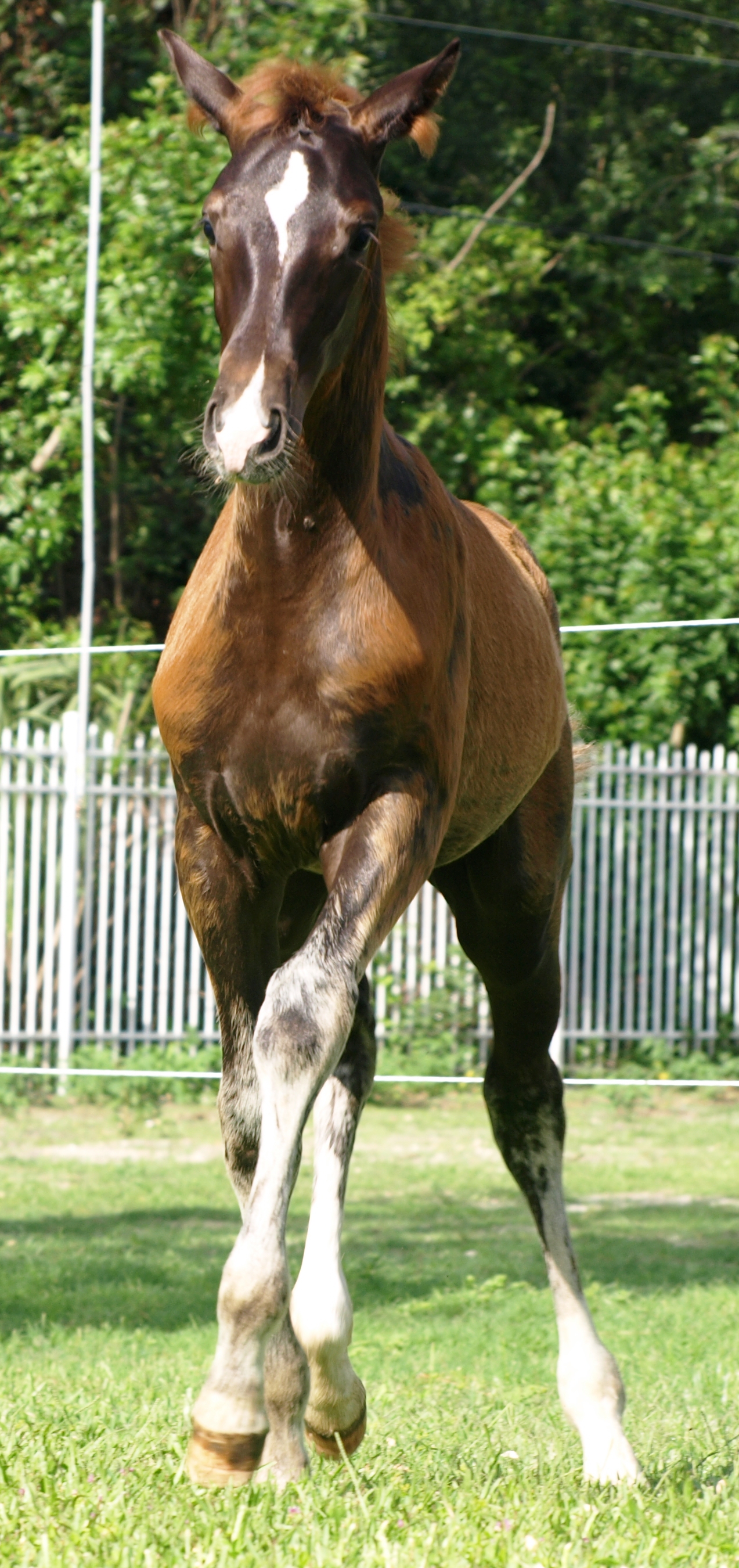 Oh my gosh, we feel so lucky to have a new healthy foal on the ground! Here is the first picture of Quickstep HW, he is by Quarterback and out of Elite mare Santina HW (Sandro Hit/Lanthan), born February 24th, 2009. He is just 3 hours old in the picture, what a nice, correct, leggy boy and check out these markings! We could not have painted them any better! The birthing was uncomplicated and he could not wait to get up and walked around for hours. Quickstep HW is super friendly and a colt with strong hind legs which will enable him to push easily off the ground and to amaze us with his movement.