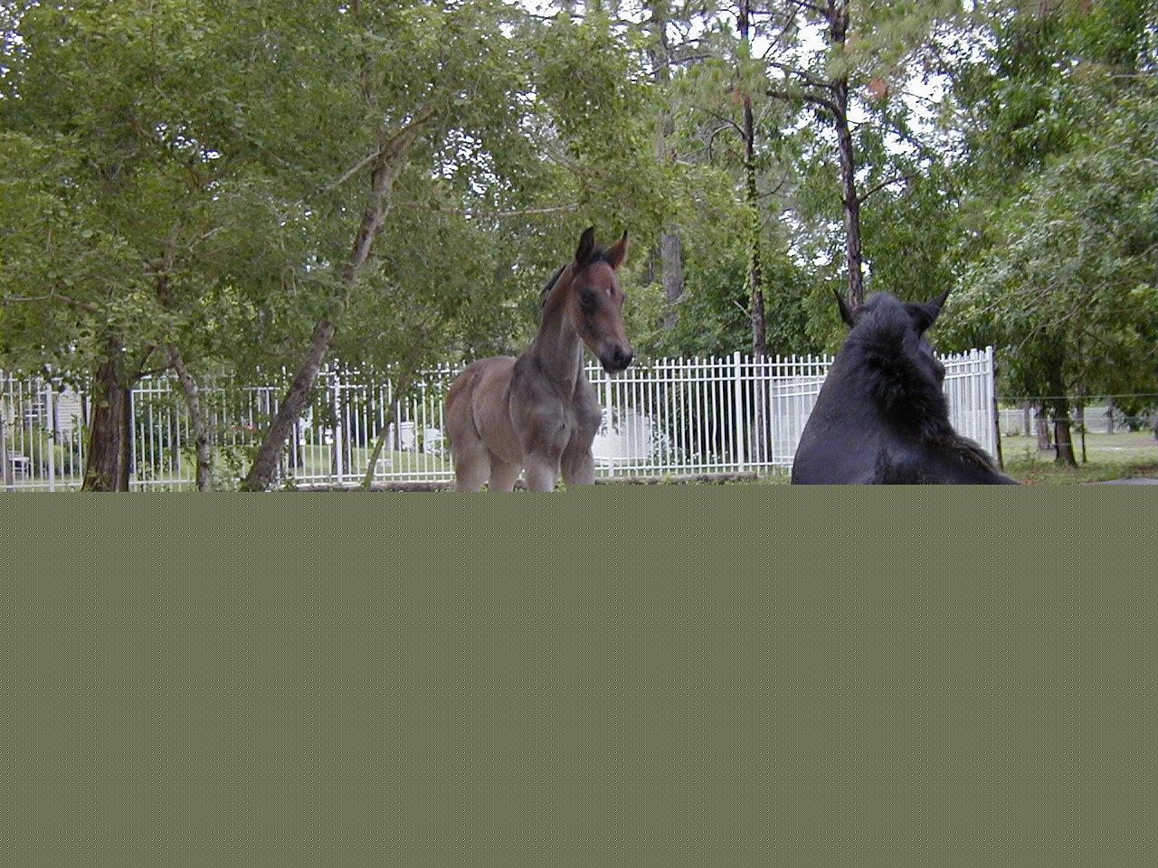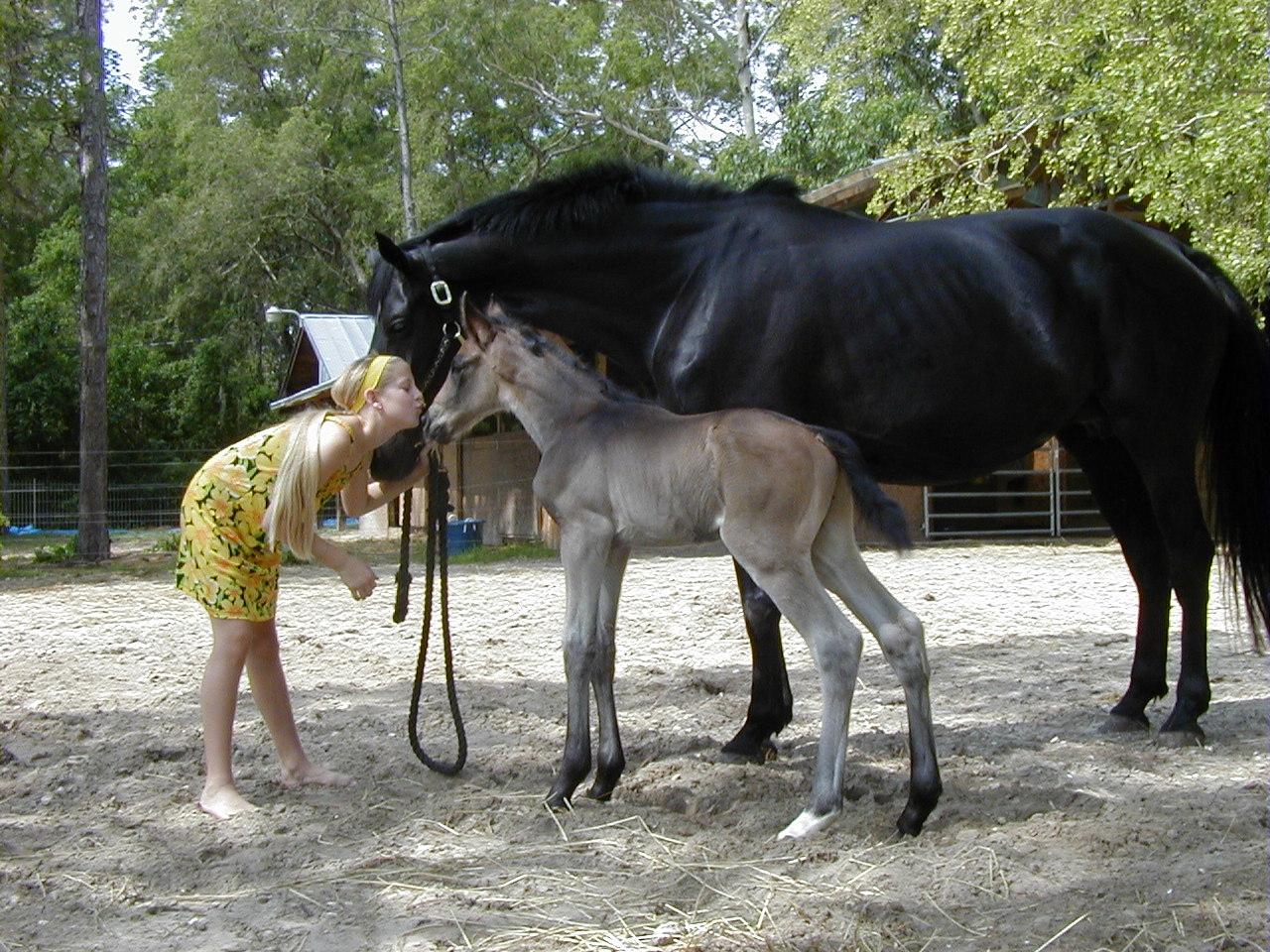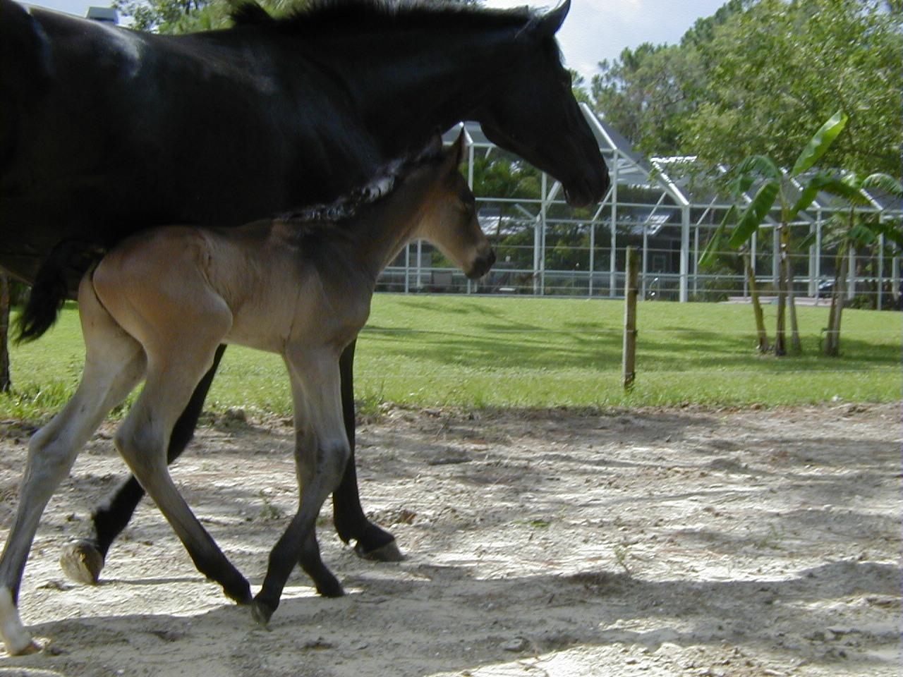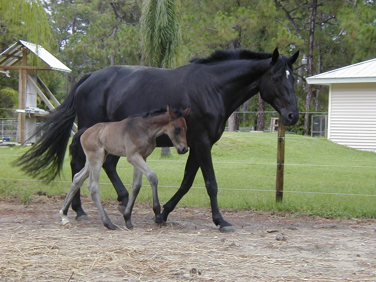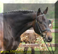 Sagenhaft HW's dam, SPS High Princess, is entered with an overall 9 in the Hanoverian marebook. High Princess' grand dam, SPS Batavia , has, among other winners, produced the 1997 Bundeschampion (National Champion of Germany for Dressage), DUVALIER by Davignon. Duvalier sold initially at Verden for DM 240,000 and then for DM 1,000,000. Her full sister scored 10s on her gaits at her inspection and is competing at I-1 right now. Their sire, the Elite Trakehner Stallion Hohenstein (Caprimond/Matador) with a Dressage Index of 148.29 points, sired the 2001 Silver Medallist at the World Young Dressage Horse Championships, Munchhausen, and the 2000 German Vice Federal Champion, Habitus. "Sagenhaft HW" Here is our newest family member, born May 23rd, 2003. "Sagenhaft HW" is out of SPS High Princess (Hohenstein/Donnerhall/Bolero) and he'll be as black as his mom and his dad (Sandro Hit). We can barely go out of the barn anymore, he is so gorgeous and it's so much fun to watch him. "Sagenhaft HW" loves to cuddle and follows us around all day long and he already jumps as high as the moon and his movements are incredible. Huge knee action and a lot of airtime are fun for him. We are so happy with him, that we'll breed SPS High Princess back to Sandro Hit this year and we would be very happy to get another foal out of the same bloodlines. Just click on a picture to enlarge it Here are the pictures right after he was born and the next morning. Information about Poetin, his half sister. Selten HW, Sagenhaft HW and their dam SPS High Princess (Hohenstein/Donnerhall) all together at their daily turn out in 2004: Newsflash: Selten HW and Sagenhaft HW will move to Hilltopfarms in August 2005 to grow up and get prepared for their stallion licensing.