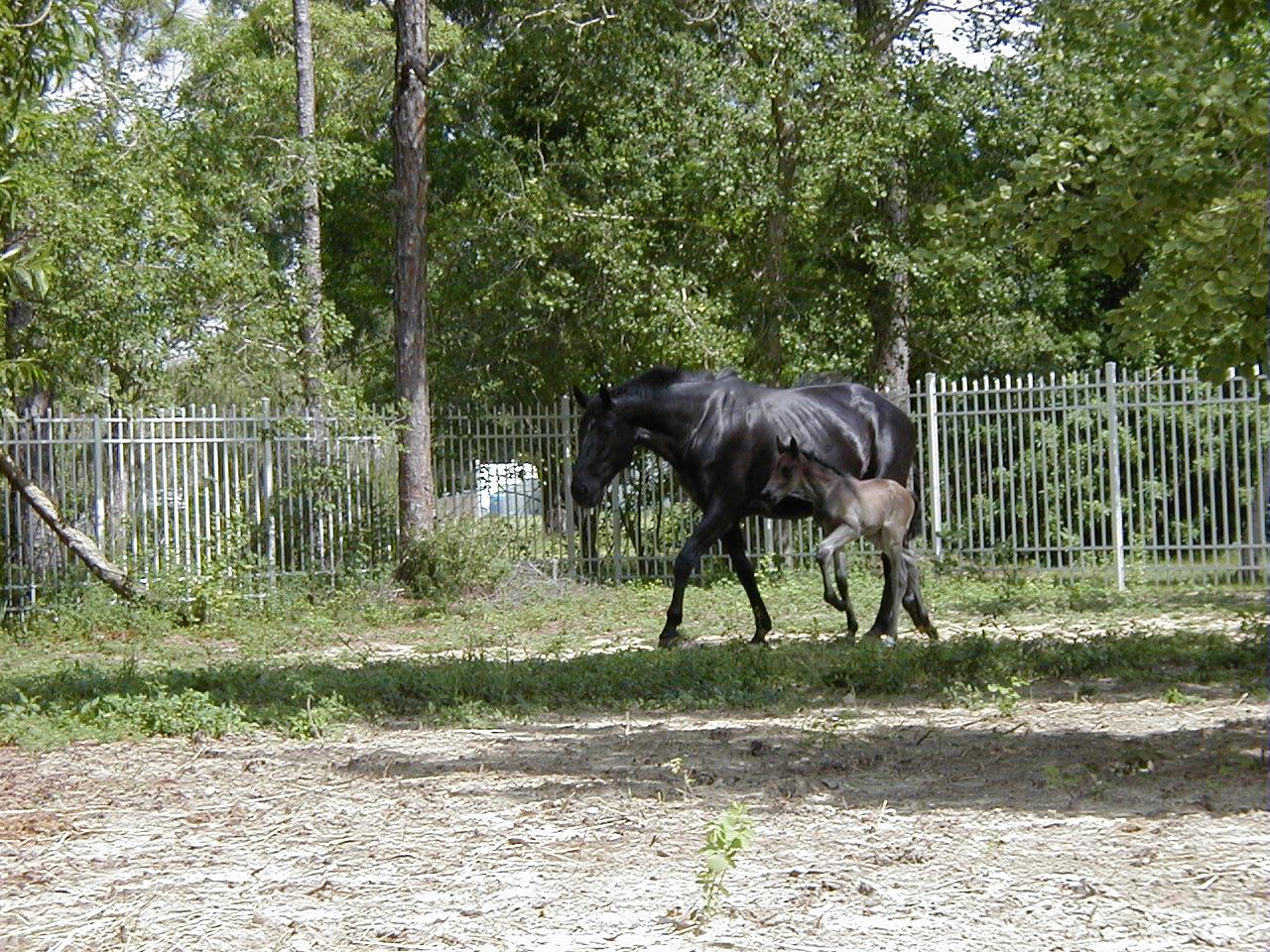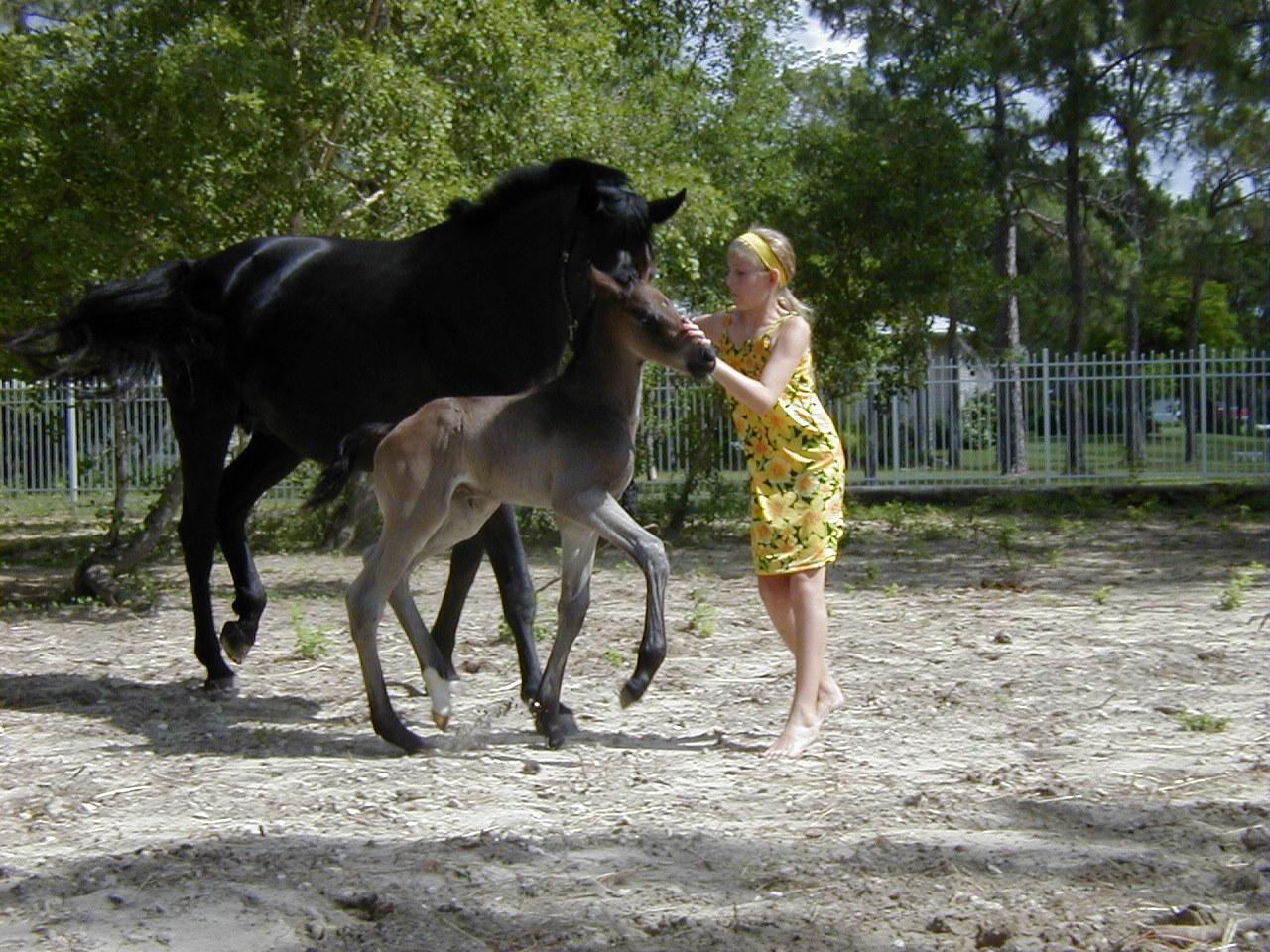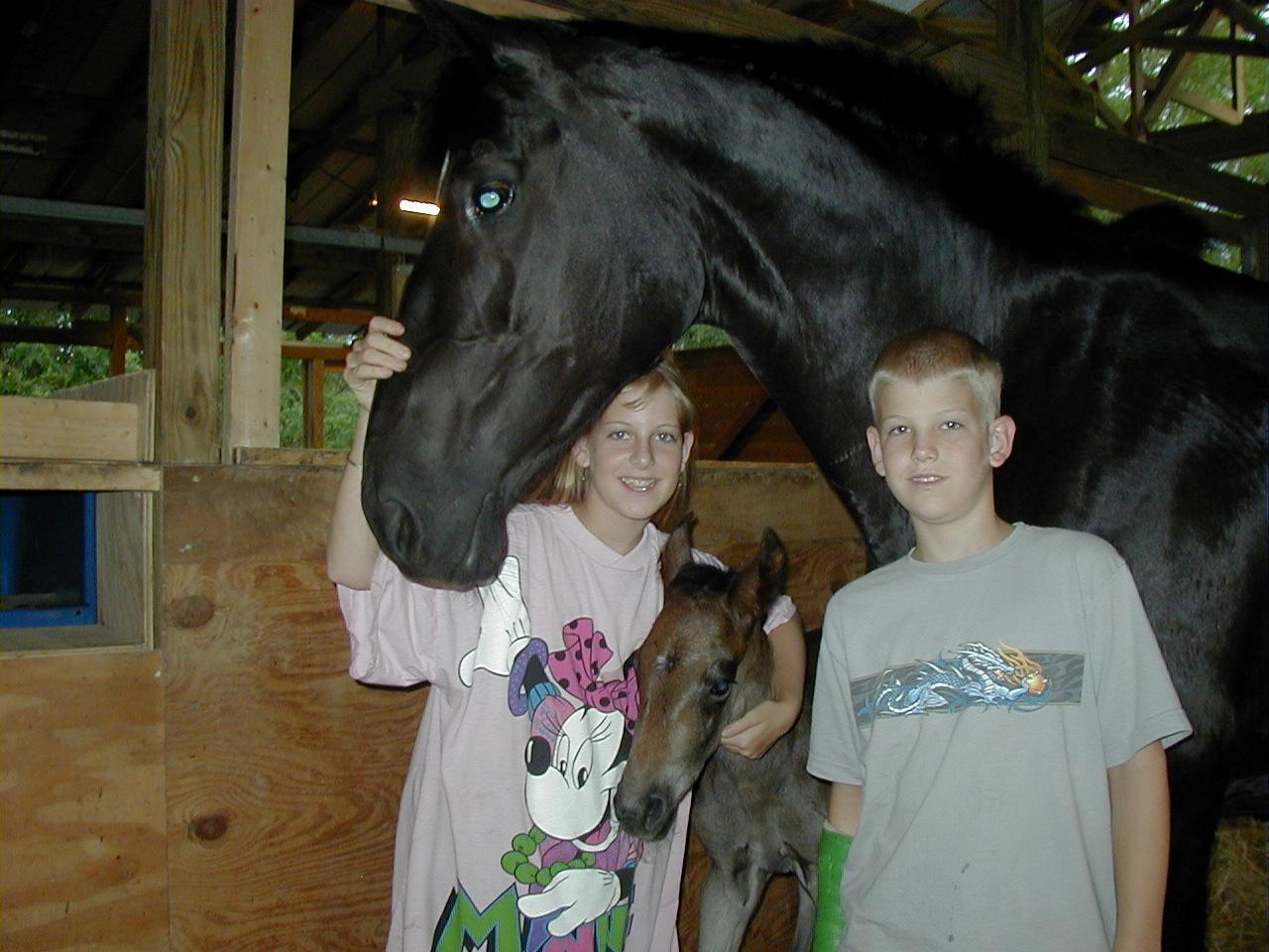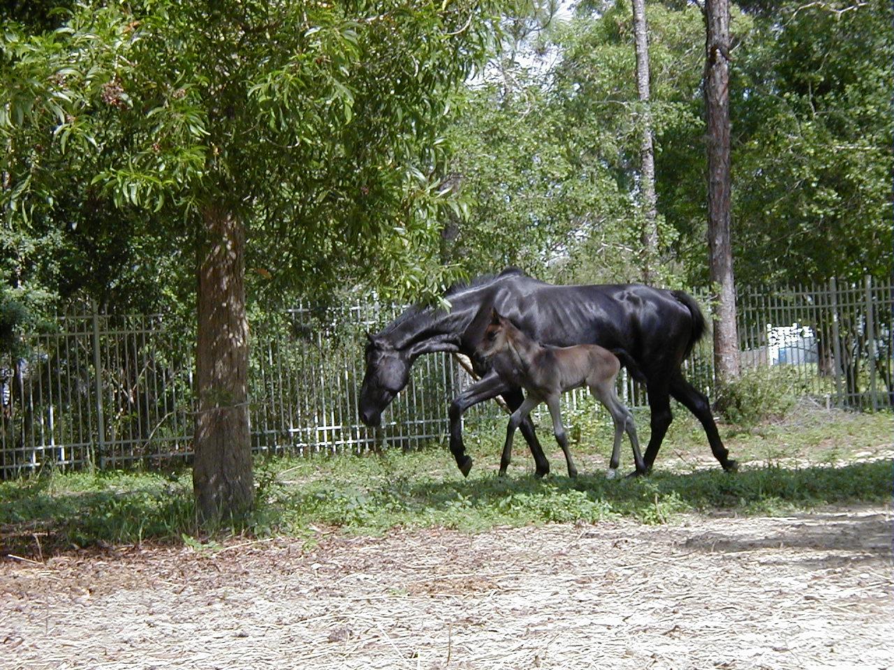 Sagenhaft HW's dam, SPS High Princess, is entered with an overall 9 in the Hanoverian marebook. High Princess' grand dam, SPS Batavia , has, among other winners, produced the 1997 Bundeschampion (National Champion of Germany for Dressage), DUVALIER by Davignon. Duvalier sold initially at Verden for DM 240,000 and then for DM 1,000,000. Her full sister scored 10s on her gaits at her inspection and is competing at I-1 right now. Their sire, the Elite Trakehner Stallion Hohenstein (Caprimond/Matador) with a Dressage Index of 148.29 points, sired the 2001 Silver Medallist at the World Young Dressage Horse Championships, Munchhausen, and the 2000 German Vice Federal Champion, Habitus. "Sagenhaft HW" Here is our newest family member, born May 23rd, 2003. "Sagenhaft HW" is out of SPS High Princess (Hohenstein/Donnerhall/Bolero) and he'll be as black as his mom and his dad (Sandro Hit). We can barely go out of the barn anymore, he is so gorgeous and it's so much fun to watch him. "Sagenhaft HW" loves to cuddle and follows us around all day long and he already jumps as high as the moon and his movements are incredible. Huge knee action and a lot of airtime are fun for him. We are so happy with him, that we'll breed SPS High Princess back to Sandro Hit this year and we would be very happy to get another foal out of the same bloodlines. Just click on a picture to enlarge it Here are the pictures right after he was born and the next morning. Information about Poetin, his half sister. Selten HW, Sagenhaft HW and their dam SPS High Princess (Hohenstein/Donnerhall) all together at their daily turn out in 2004: Newsflash: Selten HW and Sagenhaft HW will move to Hilltopfarms in August 2005 to grow up and get prepared for their stallion licensing.