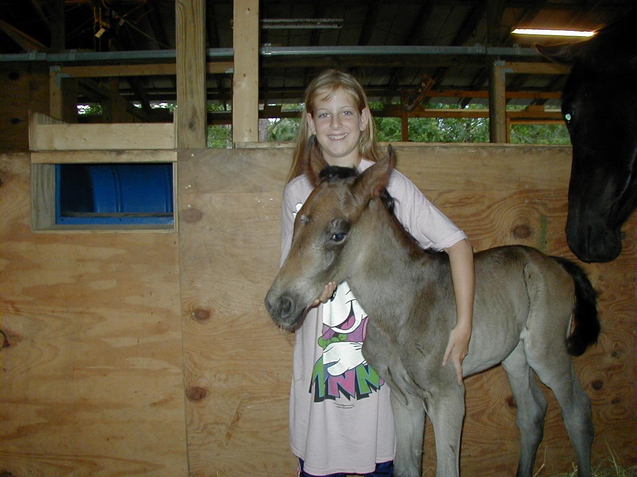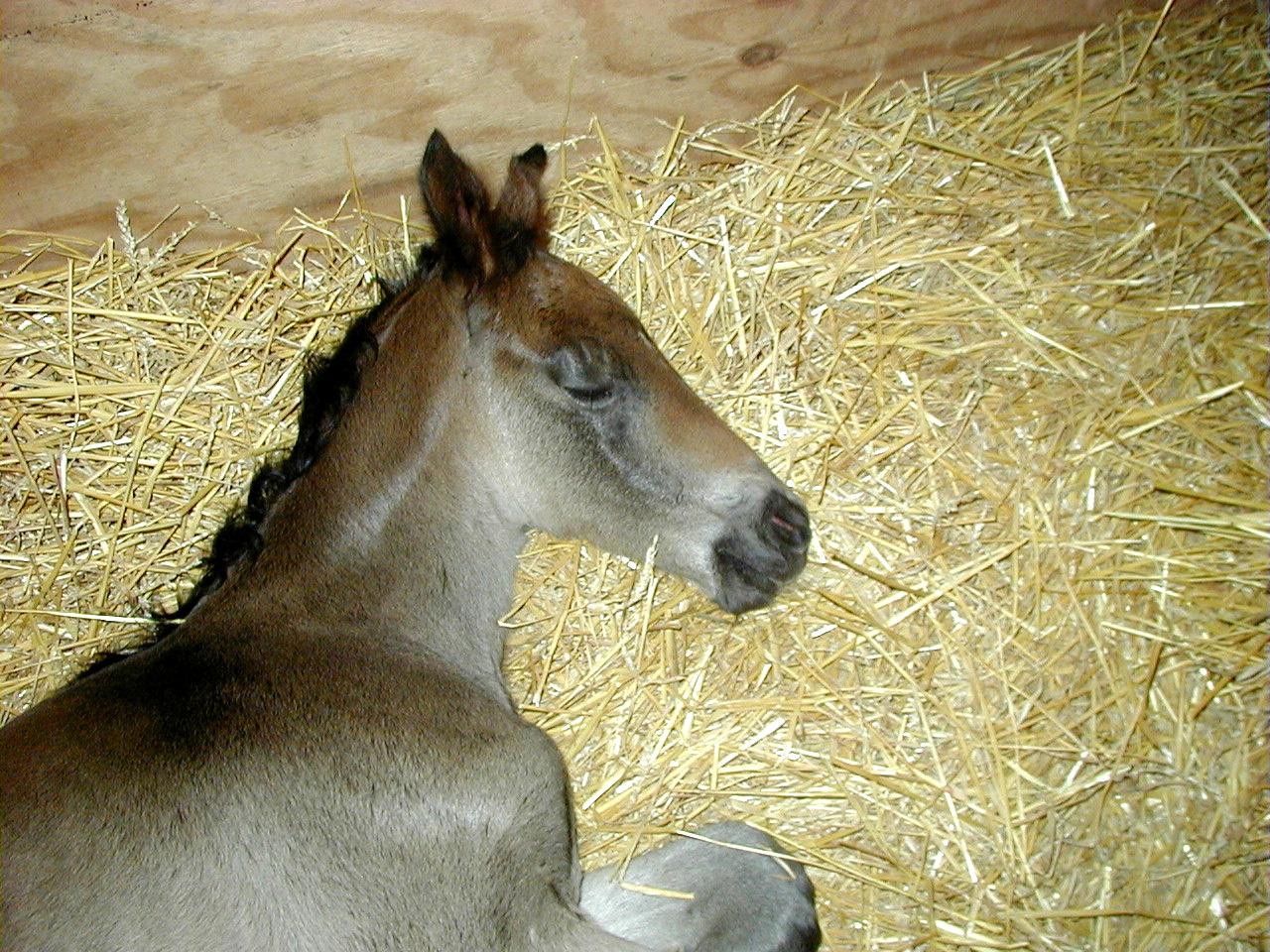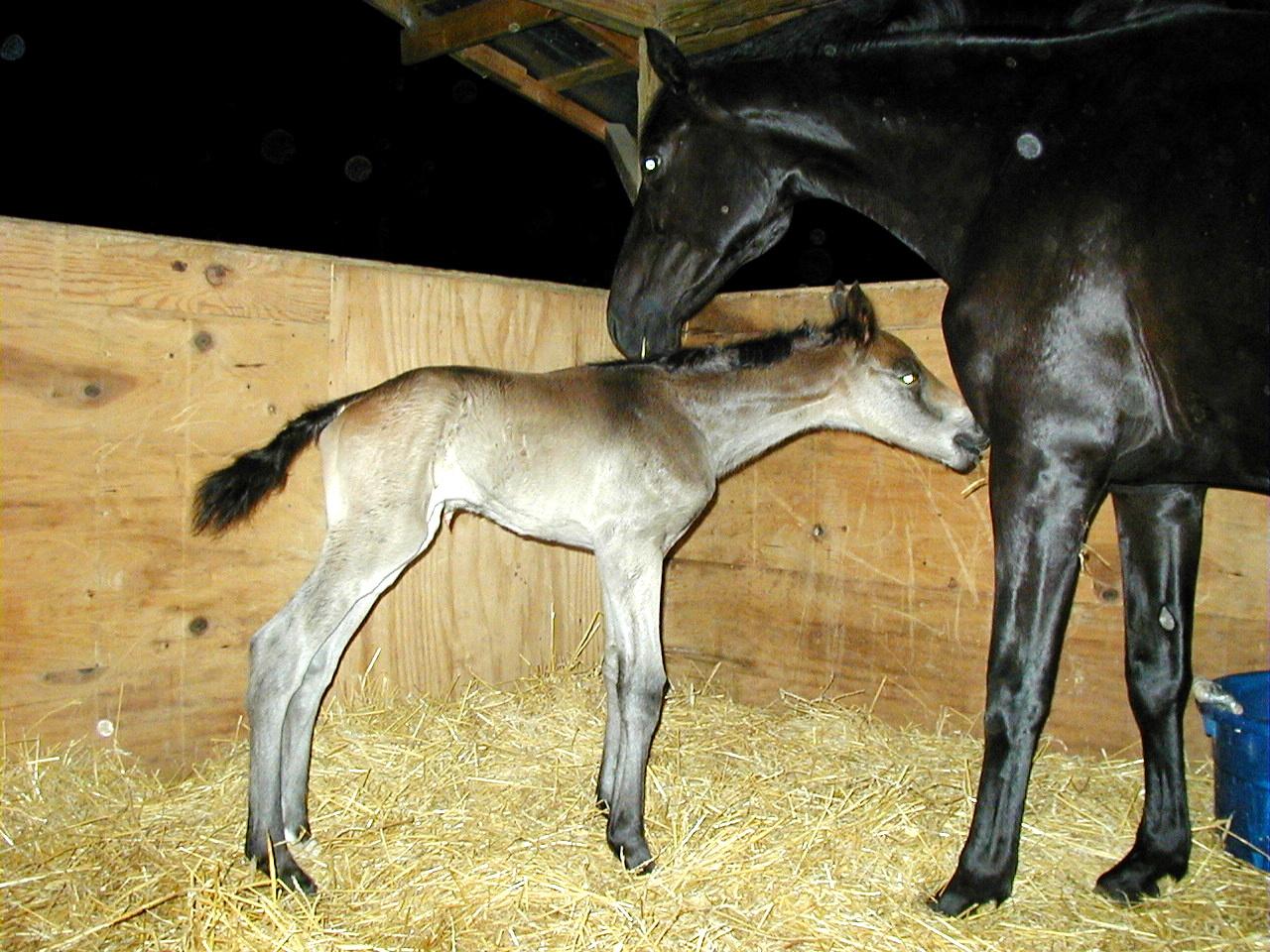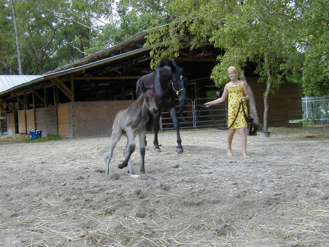 Sagenhaft HW's dam, SPS High Princess, is entered with an overall 9 in the Hanoverian marebook. High Princess' grand dam, SPS Batavia , has, among other winners, produced the 1997 Bundeschampion (National Champion of Germany for Dressage), DUVALIER by Davignon. Duvalier sold initially at Verden for DM 240,000 and then for DM 1,000,000. Her full sister scored 10s on her gaits at her inspection and is competing at I-1 right now. Their sire, the Elite Trakehner Stallion Hohenstein (Caprimond/Matador) with a Dressage Index of 148.29 points, sired the 2001 Silver Medallist at the World Young Dressage Horse Championships, Munchhausen, and the 2000 German Vice Federal Champion, Habitus. "Sagenhaft HW" Here is our newest family member, born May 23rd, 2003. "Sagenhaft HW" is out of SPS High Princess (Hohenstein/Donnerhall/Bolero) and he'll be as black as his mom and his dad (Sandro Hit). We can barely go out of the barn anymore, he is so gorgeous and it's so much fun to watch him. "Sagenhaft HW" loves to cuddle and follows us around all day long and he already jumps as high as the moon and his movements are incredible. Huge knee action and a lot of airtime are fun for him. We are so happy with him, that we'll breed SPS High Princess back to Sandro Hit this year and we would be very happy to get another foal out of the same bloodlines. Just click on a picture to enlarge it Here are the pictures right after he was born and the next morning. Information about Poetin, his half sister. Selten HW, Sagenhaft HW and their dam SPS High Princess (Hohenstein/Donnerhall) all together at their daily turn out in 2004: Newsflash: Selten HW and Sagenhaft HW will move to Hilltopfarms in August 2005 to grow up and get prepared for their stallion licensing.