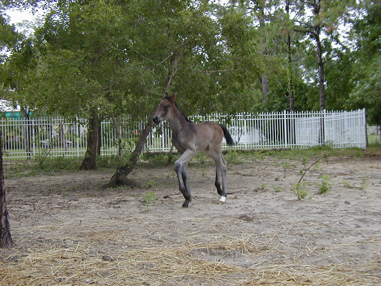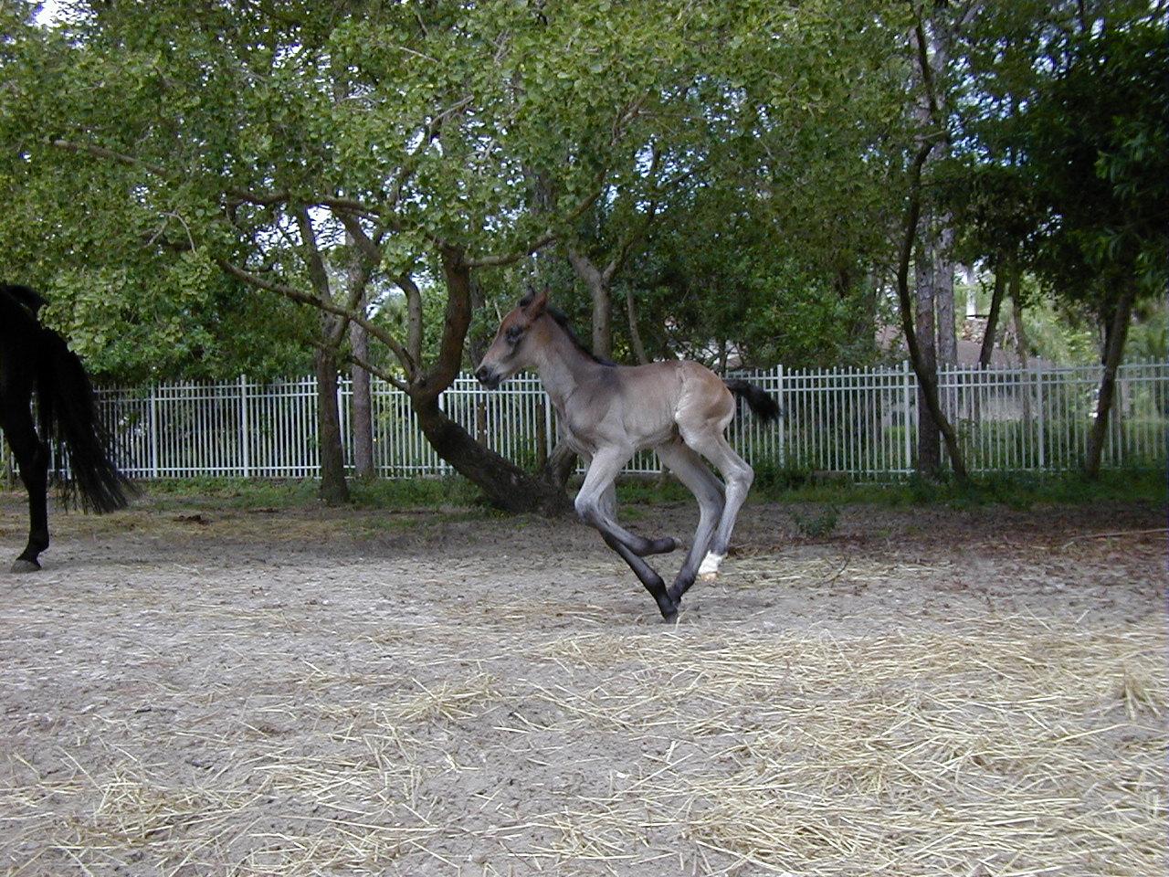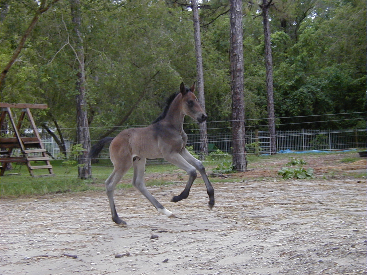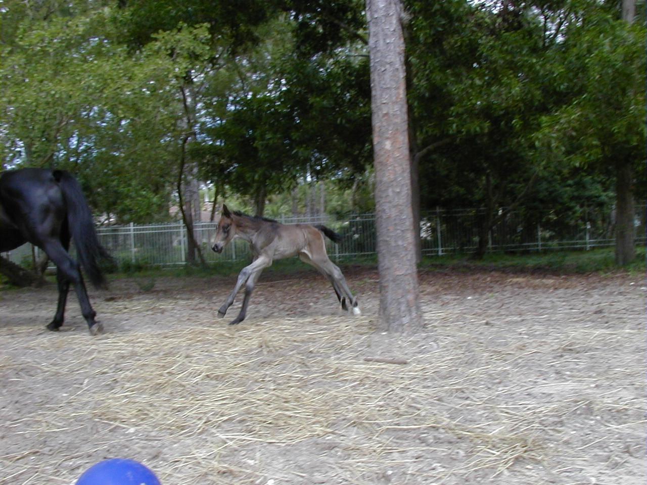 Sagenhaft HW's dam, SPS High Princess, is entered with an overall 9 in the Hanoverian marebook. High Princess' grand dam, SPS Batavia , has, among other winners, produced the 1997 Bundeschampion (National Champion of Germany for Dressage), DUVALIER by Davignon. Duvalier sold initially at Verden for DM 240,000 and then for DM 1,000,000. Her full sister scored 10s on her gaits at her inspection and is competing at I-1 right now. Their sire, the Elite Trakehner Stallion Hohenstein (Caprimond/Matador) with a Dressage Index of 148.29 points, sired the 2001 Silver Medallist at the World Young Dressage Horse Championships, Munchhausen, and the 2000 German Vice Federal Champion, Habitus. "Sagenhaft HW" Here is our newest family member, born May 23rd, 2003. "Sagenhaft HW" is out of SPS High Princess (Hohenstein/Donnerhall/Bolero) and he'll be as black as his mom and his dad (Sandro Hit). We can barely go out of the barn anymore, he is so gorgeous and it's so much fun to watch him. "Sagenhaft HW" loves to cuddle and follows us around all day long and he already jumps as high as the moon and his movements are incredible. Huge knee action and a lot of airtime are fun for him. We are so happy with him, that we'll breed SPS High Princess back to Sandro Hit this year and we would be very happy to get another foal out of the same bloodlines. Just click on a picture to enlarge it Here are the pictures right after he was born and the next morning. Information about Poetin, his half sister. Selten HW, Sagenhaft HW and their dam SPS High Princess (Hohenstein/Donnerhall) all together at their daily turn out in 2004: Newsflash: Selten HW and Sagenhaft HW will move to Hilltopfarms in August 2005 to grow up and get prepared for their stallion licensing.