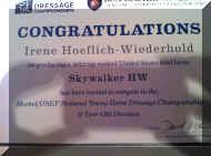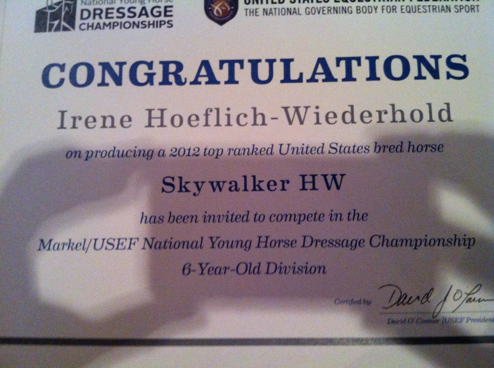 August 26th, 2012 FINAL Markel/USEF National Young Horse Dressage Championships 2012: HUGE congratulations to Catherine Reid with Skywalker HW (bred by Irene Hoeflich-Wiederhold / www.HWfarm.com ) on her Young Horse Championship final 6th place in 2012, 6 year old class. We are so super proud and happy to have bred the 6th best 6yo in the US! Yay - Catherine, thank you so much and keep it up!!! Picture shows Catherine Reid's mom and Skywalker HW. August 24th, 2012 This is so awesome! Skywalker HW, bred by Irene Hoeflich-Wiederhold / www.HWfarm.com - ridden and owned by Catherine Reid, check out this exciting certificate. Woohoo, another HW horse successful at the Young Horse Championships, again a top ranked United States bred horse! A huge thank you to Catherine!!!! You rock!!!!