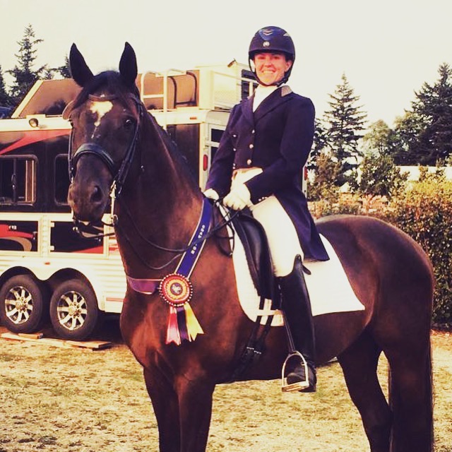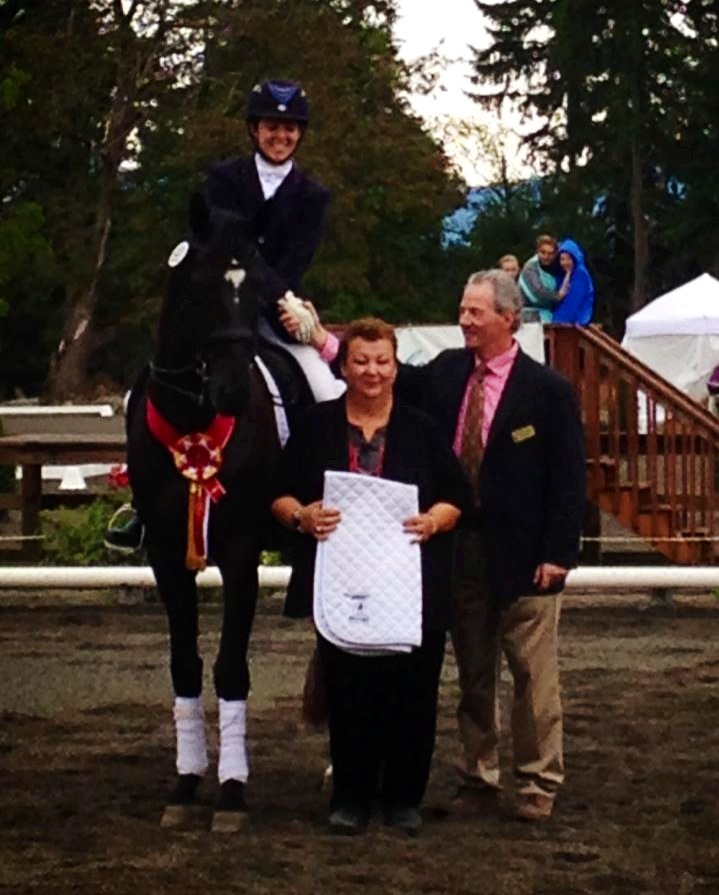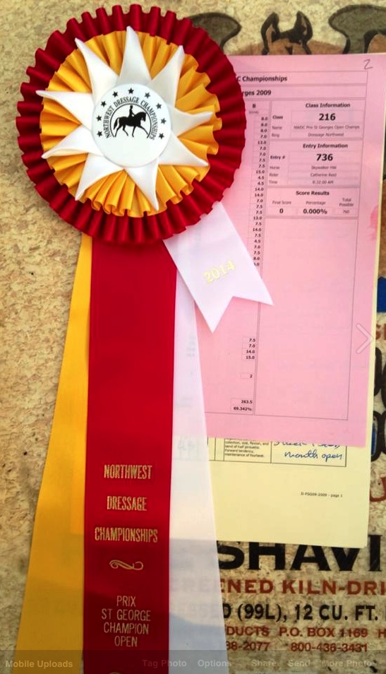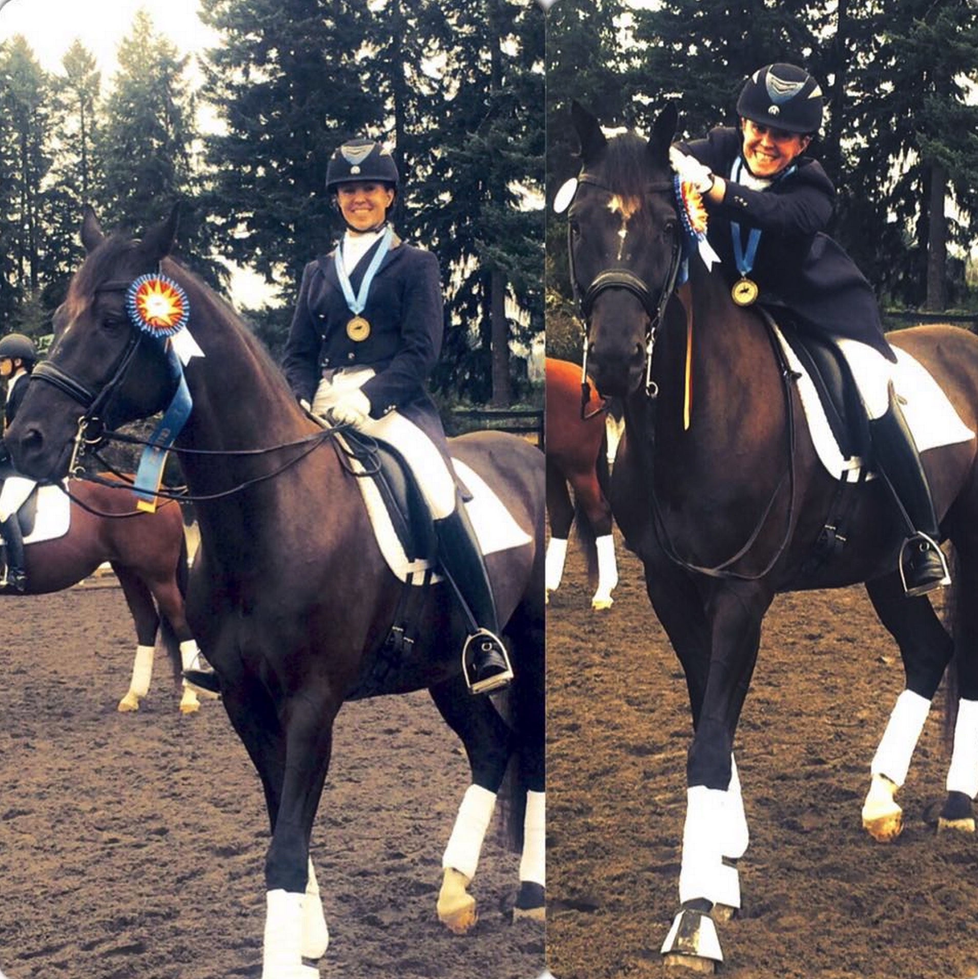 August 24th, 2015: Whidbey Equestrian Center Intermediare-1 Open CHAMPION!!! Huge congratulations!!!! Skywalker HW (bred by www.HWfarm.com) and his owner Catherine Reid - what a match. Another milestone, they accomplished to get a personal best for Catherine, at I-1 with a 72.7%. She writes the following: Still room to improve- we broke in one medium trot (I pushed for too much) and a mistake in the 3's (he added a change) But, I'm happy to say we got 8s for both canter pirouettes- a movement Shorts is still not 100% confident in The collectives give me hope for better still to come! Catherine is — feeling proud.