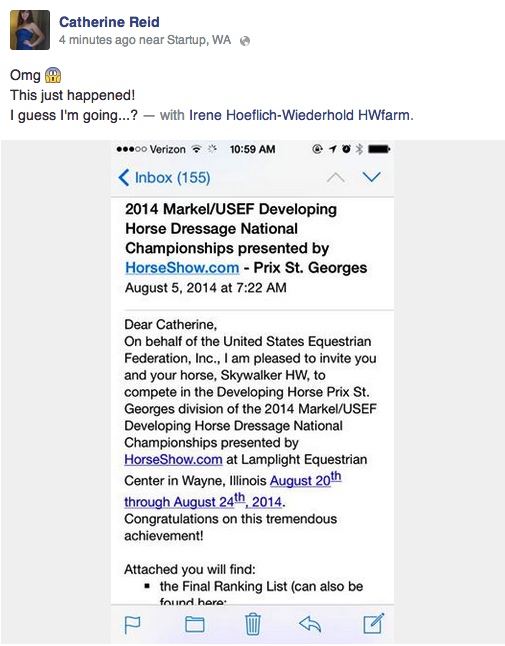 August 24th, 2014: Markel/USEF Young & Developing Horse Dressage National Championships Check out that smile, Catherine Reid and Skywalker HW (bred by www.HWfarm.com and full brother to Selten HW), just finished 5th in her class and 8th best in the country!!! More info to follow, huge congratulations to this pair, they looked amazing, totally lovely ride and great partnership! August 8th, 2014: Please help Catherine Reid and SkyWalker HW - if you can, raffle tickets or donations. Every single $$$ will count. . 2014 USEF/MARKEL DEVELOPING HORSE DRESSAGE NATIONAL CHAMPIONSHIPS .