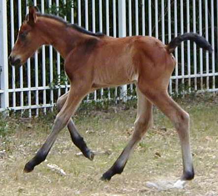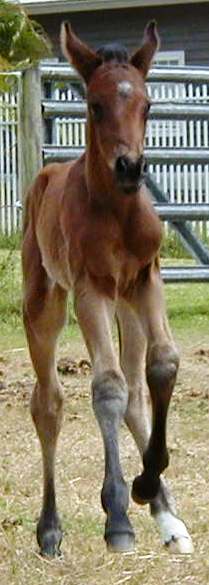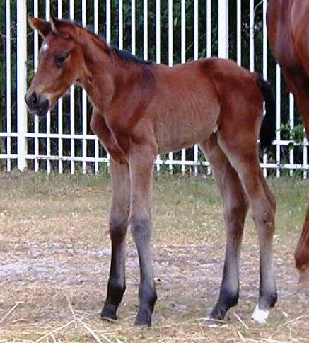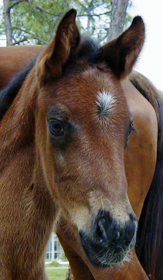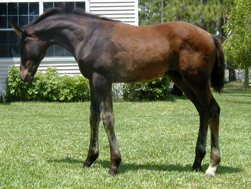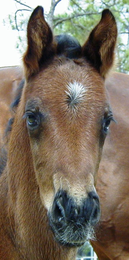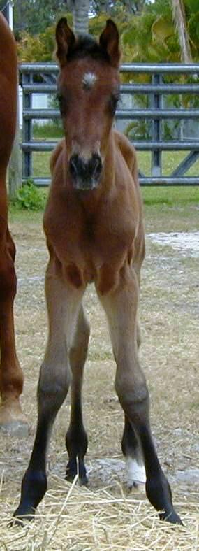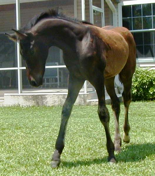 AHH - now you can really see what a wonderful colt you've got - - - nice neck - well set on nice, long, straight legs nicely set on tail awesome shoulder angle eyes set far apart - kind - gentle - and intelligent expression short coupled nice big knees and hocks great looking feet for a baby, too and pretty, besides! Bay is the "color of choice" for many!! Looks to me as if he will be tall - yet elegant/refined - with super movement - and a personality - - if I am seeing these pictures correctly!!! Thanks so much for sharing!!! - - LOVE him - CONGRATS!!!!