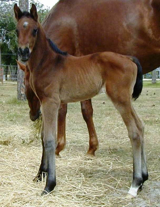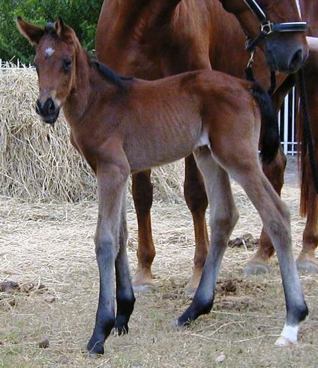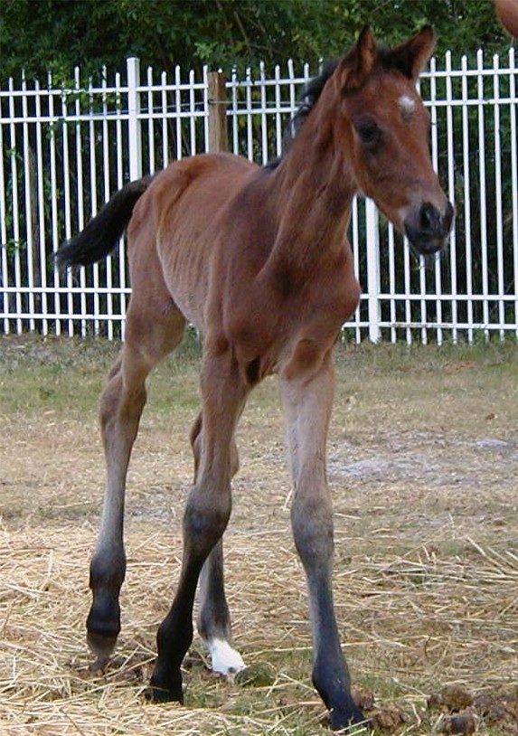And now, here is day 3 of the little boys fun, outside with his mom He is a Samarant (Sandro Hit/Brentano) colt out of our very successful and dearly loved EM Donatella HW (Don Frederico/Weltmeyer) and was born Sunday, March 11th, 2007, he is just some hours old in these pictures and his very first time out! He is a bay, leggy and refined colt and already running around and having fun. He already moves like he wants to compete with his mom and she has her “hands” full to keep him inside the fences and lined up. She was a maiden mare until this boy arrived and seems to love her job and she is pampering him all day, what a good girl. We could not be happier!!! A friend just e-mailed and evaluated the little boy, I thought it was so cute, had to put it up here: